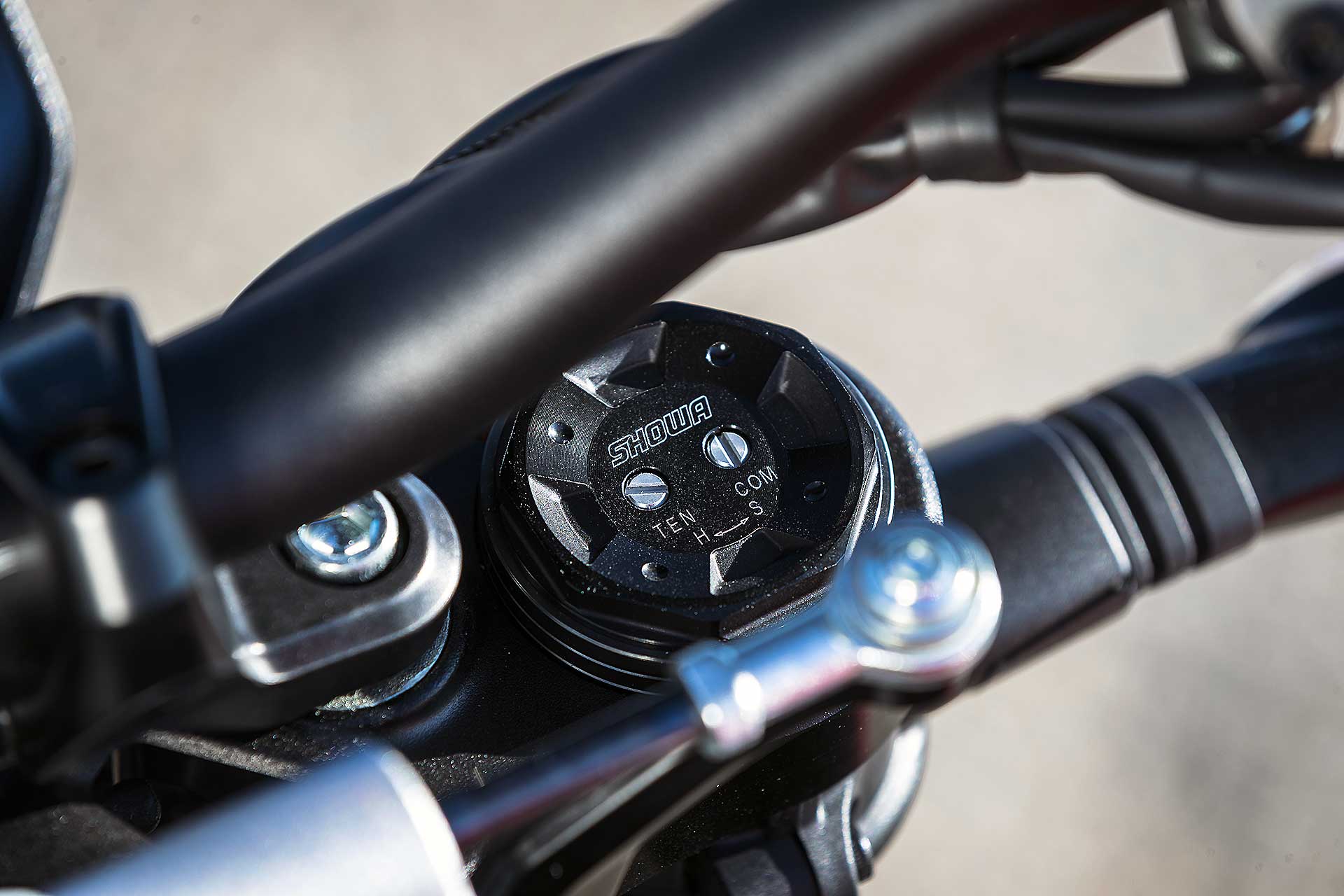 Il manubrio tubolare (belle finiture sotto agli occhi, la serigrafia sul manubrio è una chicca) è largo il giusto: né troppo, né poco, e poi secondo me è piacevolmente “sotto” e non impone una posizione distesa. A mio parere triangola bene con sella e pedane, che sono state riposizionate rispetto a quelle della Panigale, un pelo più basse e avanzate. Ne consegue una posizione di guida perfettamente coerente con il concetto di moto Streetfighter, ossia una supersportiva senza carenatura.