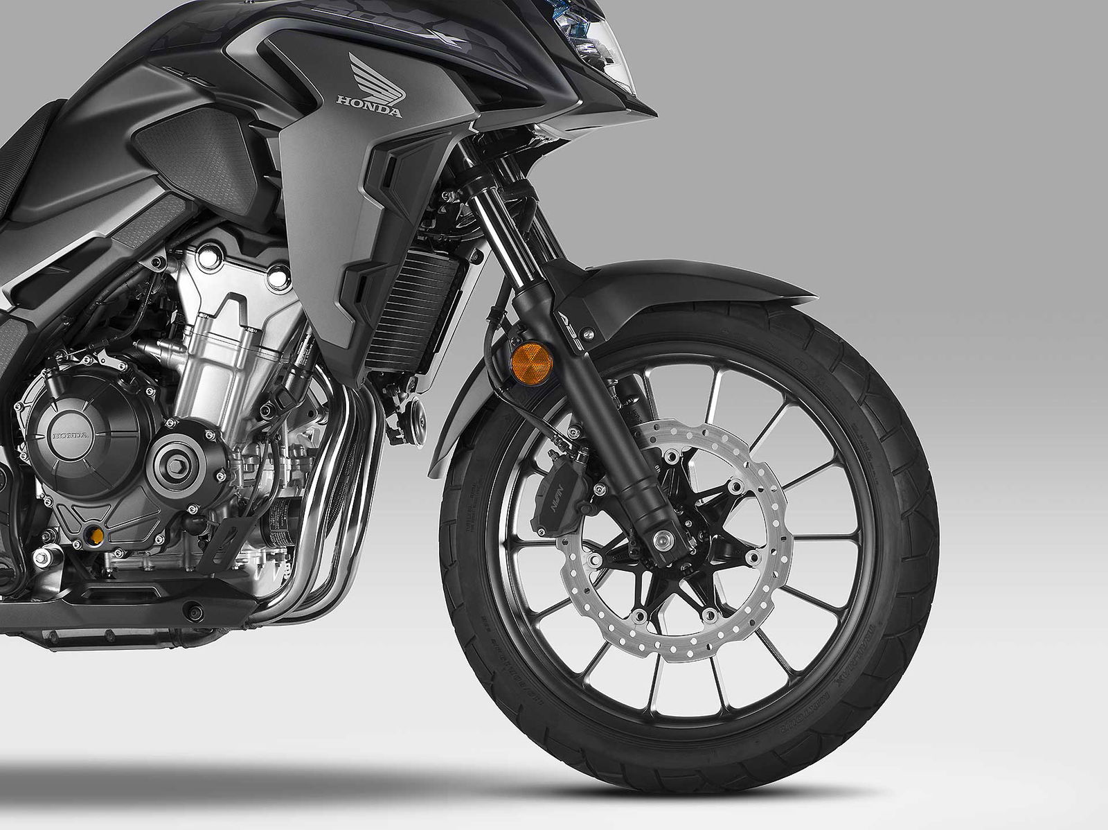 La novità più importante sulla nuova CB500X arriva infatti nel reparto ciclistico: la ruota anteriore è cresciuta nel diametro, da 17 a 19”, a garanzia di una guida più rotonda su strada e più efficace quando termina l’asfalto. Un dettaglio non certo trascurabile, perché cambiando il diametro del cerchio cambiano di conseguenza le quote vitali della moto: l’interasse cresce fino a 1.443 mm (+ 23 mm), l’inclinazione del cannotto di sterzo guadagna quasi un grado e raggiunge i 27,4°, aumenta l’altezza della sella che raggiunge quota 830 mm.