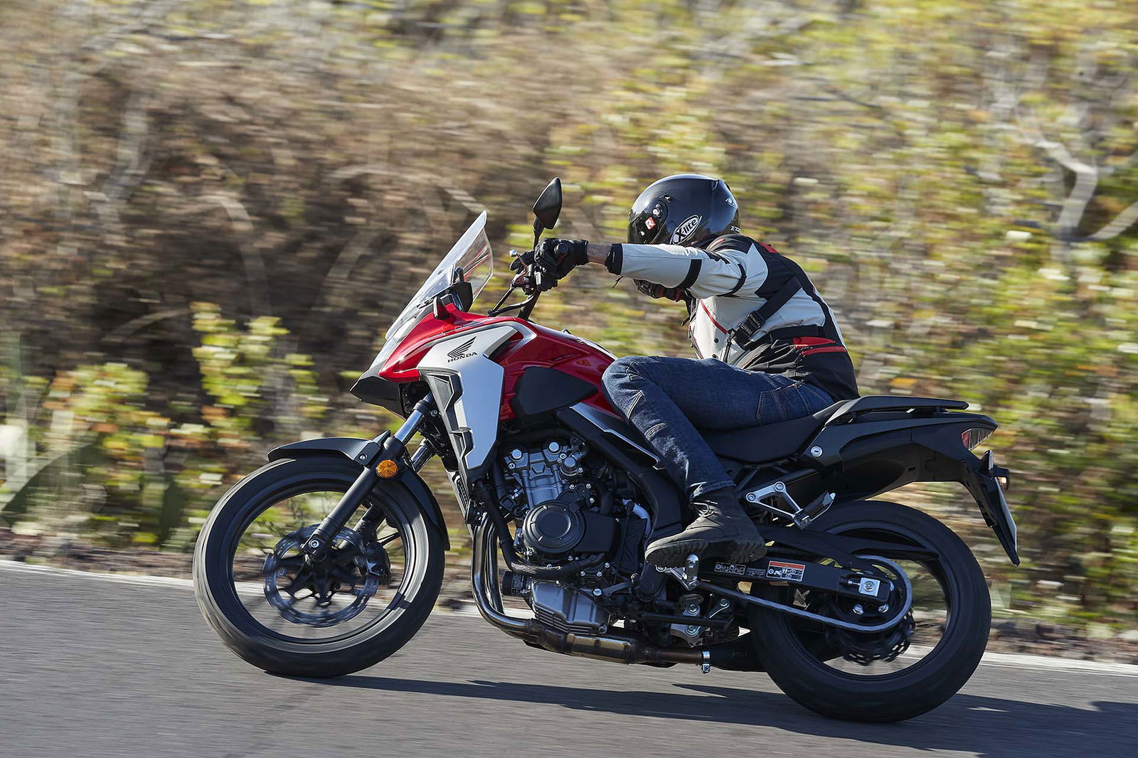La ciclistica è accompagnata da un motore pacifico ma non insipido: per loro natura, i bicilindrici paralleli hanno una curva di erogazione piatta e lineare, senza prediligere particolari regimi. Il bicilindrico della Honda CB500X però riesce comunque a strappare un sorriso, soprattutto quando la lancetta del contagiri supera quota 5.000. Sotto tale regime è regolare ma non ha molta forza (non come quella di un monocilindrico, per intendersi): ecco perché nelle salite di montagna richiede un frequente utilizzo del cambio, che tra l’altro è corto e molto preciso, anche sotto stress.Fuori dalla strada