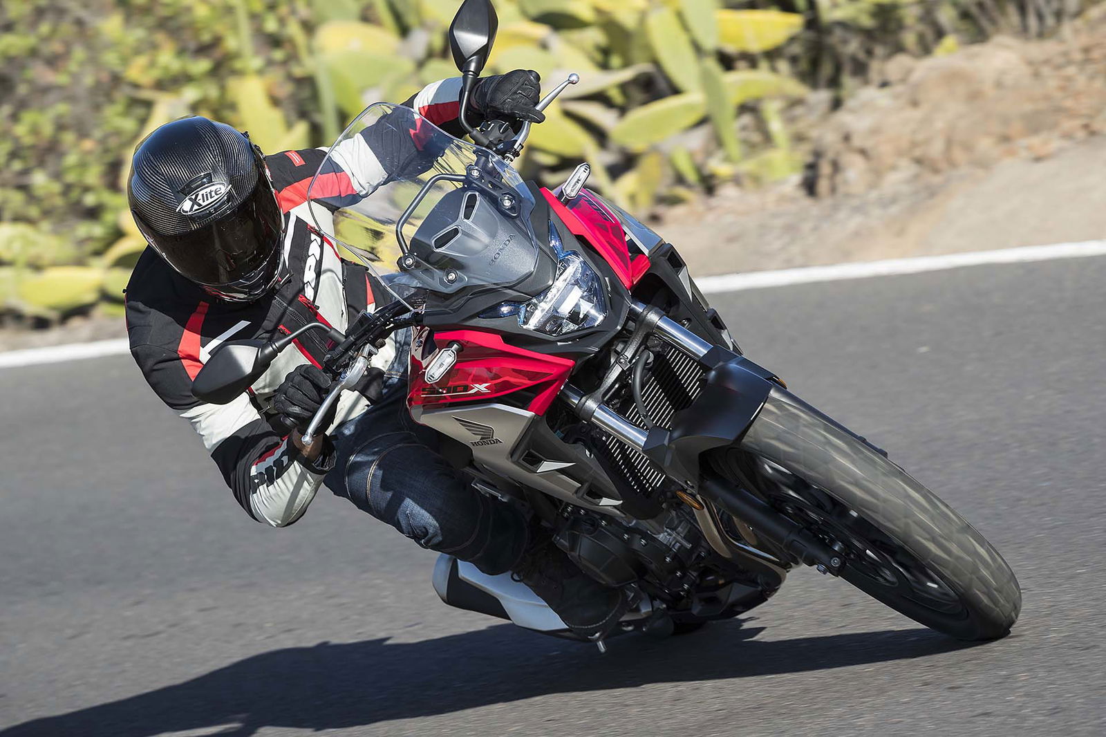 La nuova Honda CB500X è una moto matura ma semplice da gestire. L’equilibrio della ciclistica e la dolcezza di motore e comandi (cambio e frizione meritano la lode) rendono facile qualunque genere di manovra, anche nel traffico della città. Il baricentro rialzato l’ha resa solo in parte meno agile: la CB500X non risponde mai nervosa o irruenta, smorzando invece eventuali input scorretti impartiti da un pilota alle prime armi.19, il numero perfettoIl merito di questo comportamento è da attribuire al nuovo cerchio anteriore. Sacrificando un po’ di rapidità, la nuova CB curva in maniera più tonda e meno spigolosa, senza mostrare le tipiche reazioni nervose delle moto di piccola cilindrata. Si guida spediti ma disinvolti, sicuri di avere sostegno a sufficienza (le sospensioni sono lunghe ma ben tarate) e di poter correggere eventuali errori senza particolari sforzi. La guida all’attacco, fatta di staccate furibonde e ingressi in curva fulminei, non è il suo territorio: molto più naturale farsi cullare dal suo assetto confortevole ma non cedevole e dalla sua guida rotonda, quella tipica delle crossover.Piccolo urlatore