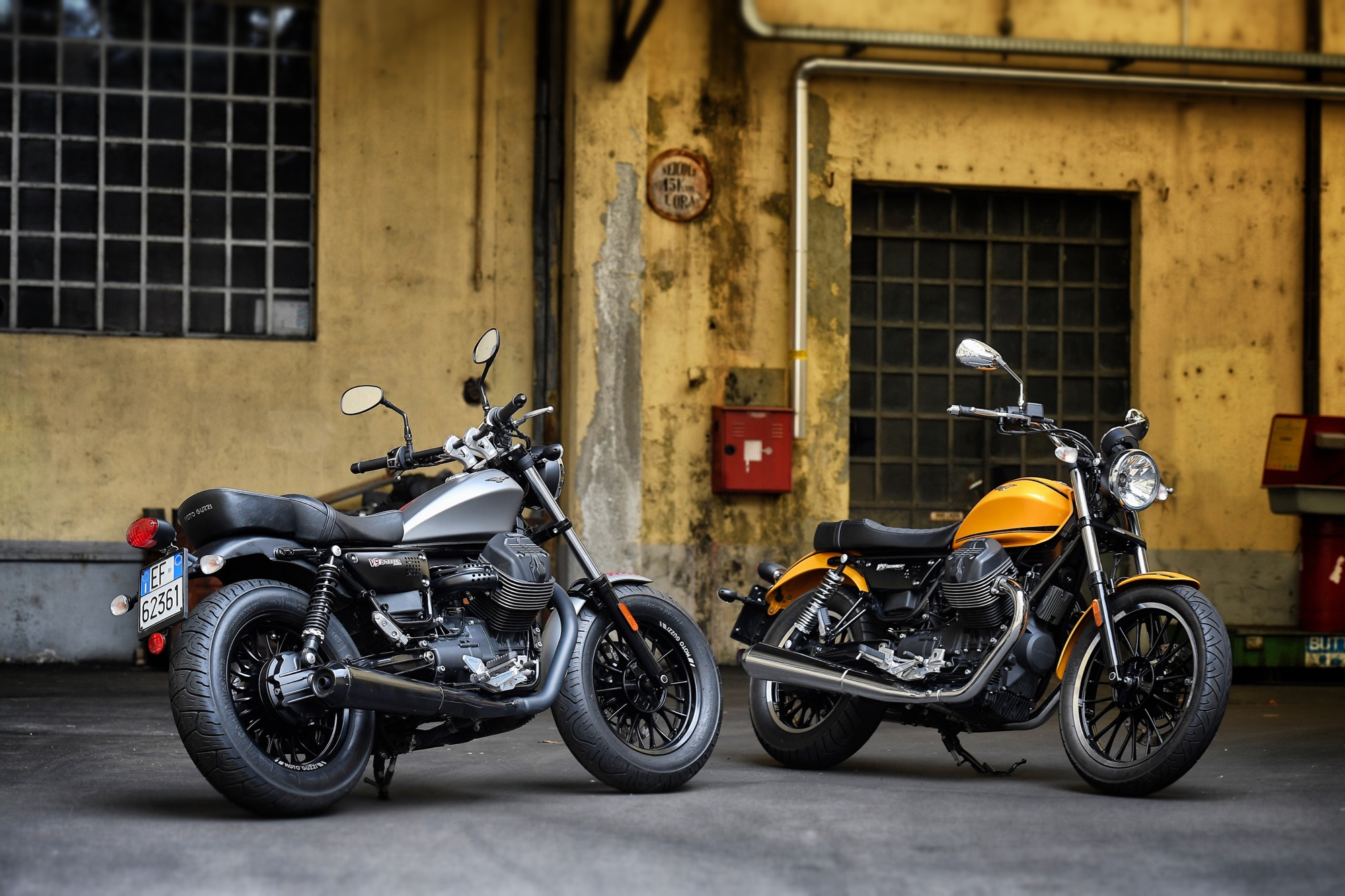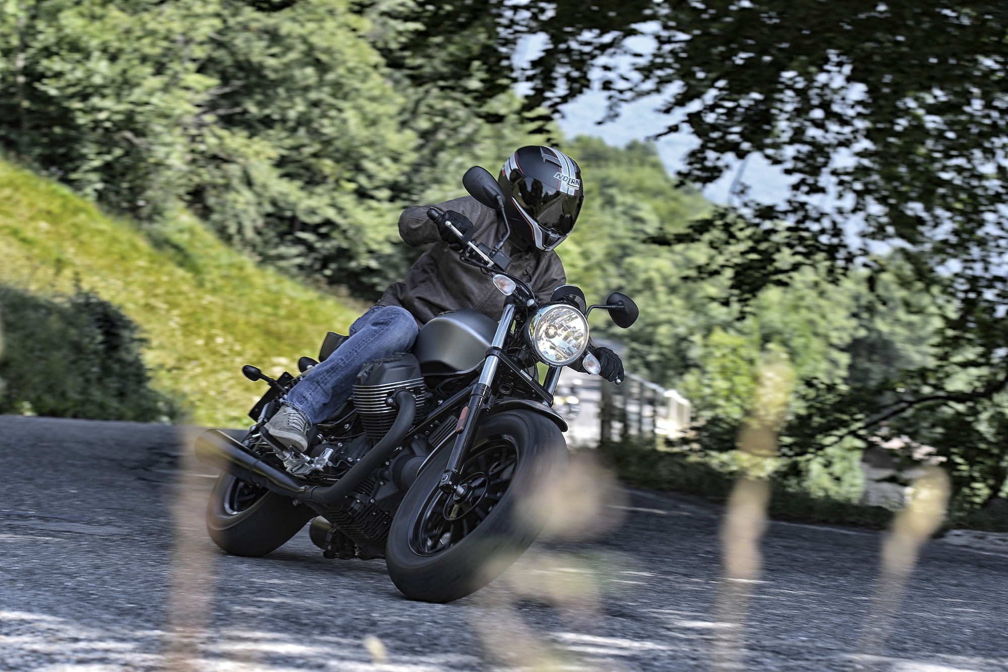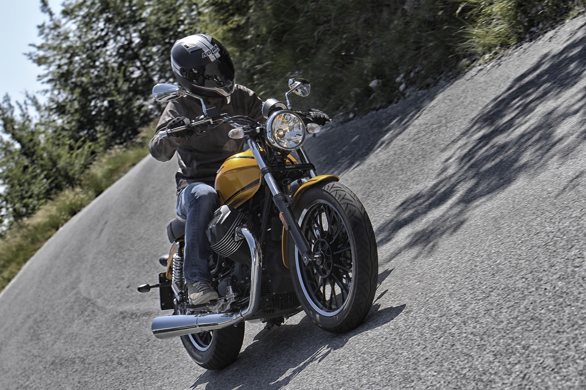 Lanciate lo scorso anno (leggi la prova), le Moto Guzzi V9 sono state aggiornate in pochi dettagli, affinamenti per modelli già ben riusciti alla loro prima “edizione”. Il bicilindrico trasversale a V di 90° di 850 cc con distribuzione a due valvole è al centro del progetto. Pur derivato dallo “Small Block” della V7 ha tanti componenti diversi e va considerato di conseguenza un motore del tutto nuovo: cilindri, pistoni, bielle, testata – ridisegnata con camere di combustione progettate per ottenere l’omologazione Euro4, risultato interessante per un motore raffreddato ad aria -, frizione a secco irrobustita, cambio con nuovi rapporti per prima e sesta, trasmissione con albero a doppio giunto disassato per lasciare spazio a pneumatici di sezione maggiorata.La distribuzione è ad aste e bilancieri, con due valvole per cilindro. Ad abbattere le emissioni inquinanti concorre il sistema di immissione d’aria nei condotti di scarico, abbinato al catalizzatore trivalente e a due sonde Lambda.