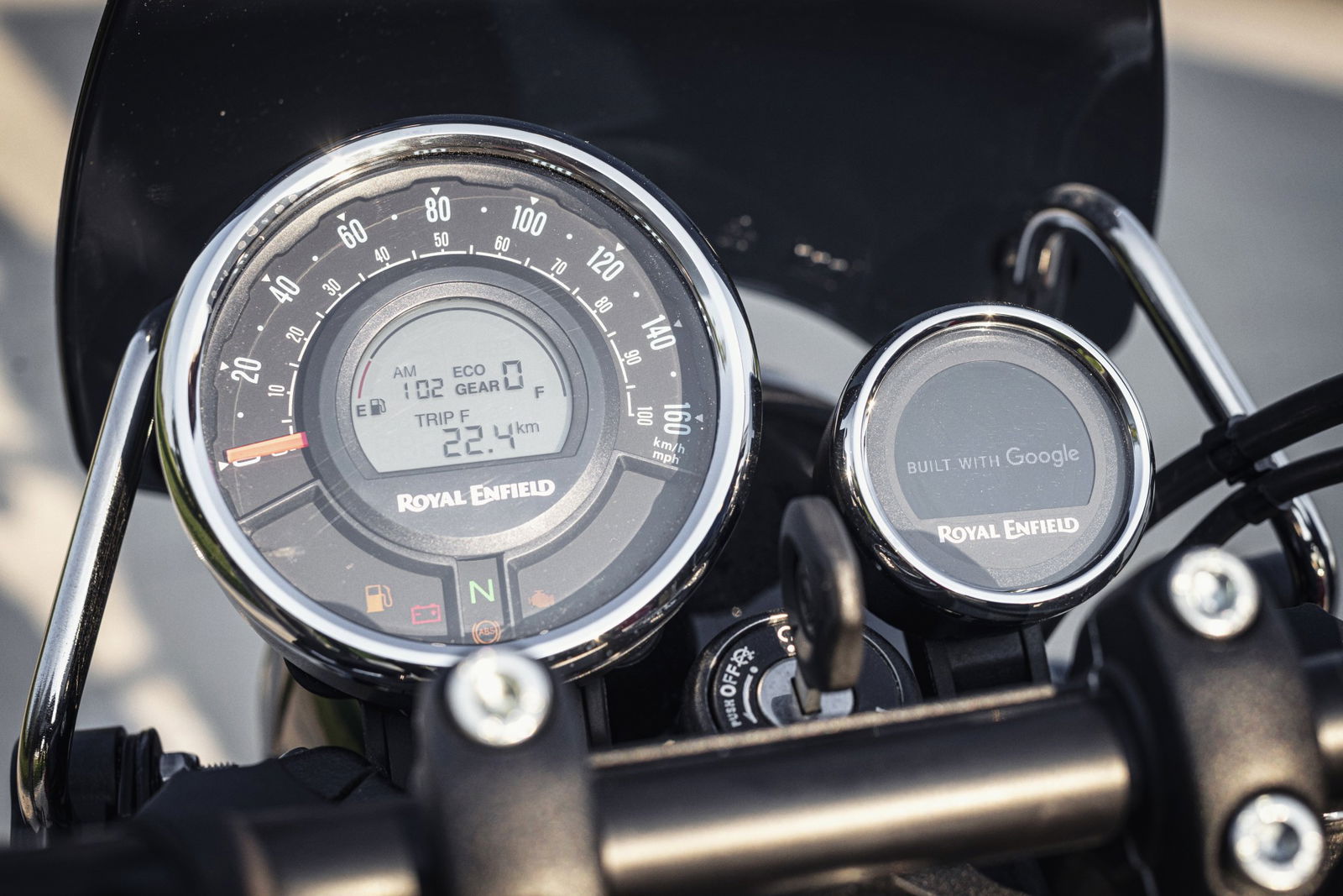 A sorprendere è la presenza (debutto, per una Royal Enfield) dell’inedito pod di navigazione TBT (turn-by-turn), Royal Enfield Tripper: un display di navigazione con funzione mirroring e indicazioni passo-passo in tempo reale. Collegabile allo smartphone tramite l’app Royal Enfield, il Tripper è una soluzione semplice ed efficace che tramite lo strumento di navigazione per moto di Google Maps assiste la guida in maniera non invasiva. E non finisce qui… Sulla Meteor trovate anche una porta USB, integrata sotto il manubrio per consentire la ricarica in movimento.