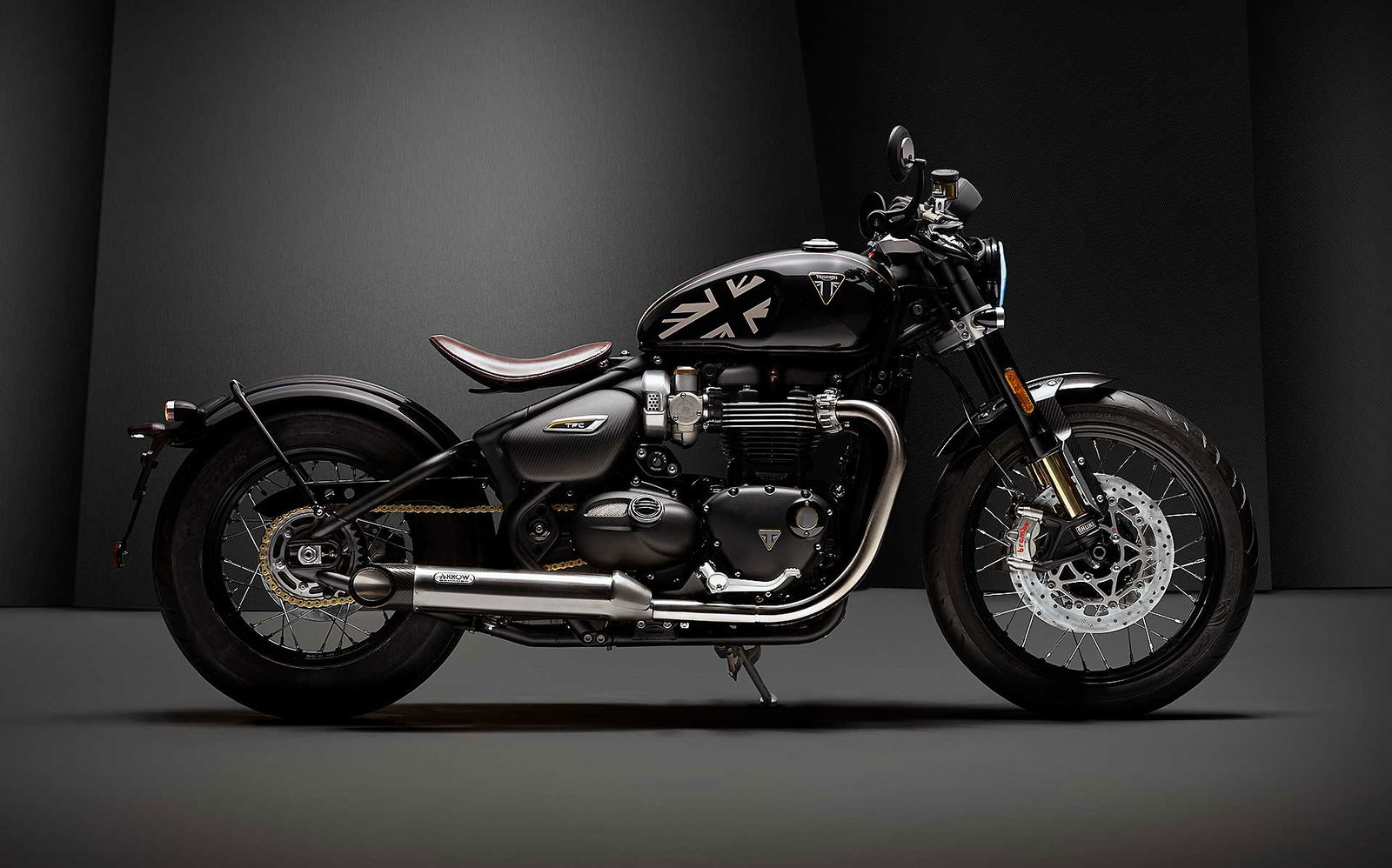 La linea inconfondibilmente “bobber” non si tocca, però si può impreziosire. Ecco dunque fibra di carbonio a volontà per le sovrastrutture, tanti particolari ricavati dal pieno, come le teste della forcella e pelle pregiata per la sella (che mantiene la possibilità di regolazione dell’avanzamento). Nuovi anche i semimanubri e la conseguente posizione di guida, più sportiva. Per finire, un spennellata di nero, che non guasta mai, su cerchi, telaio e forcellone, carter motore e sospensioni, con l’unica concessione di un lampo dorato che viene dalla catena e da un filetto sul serbatoio.