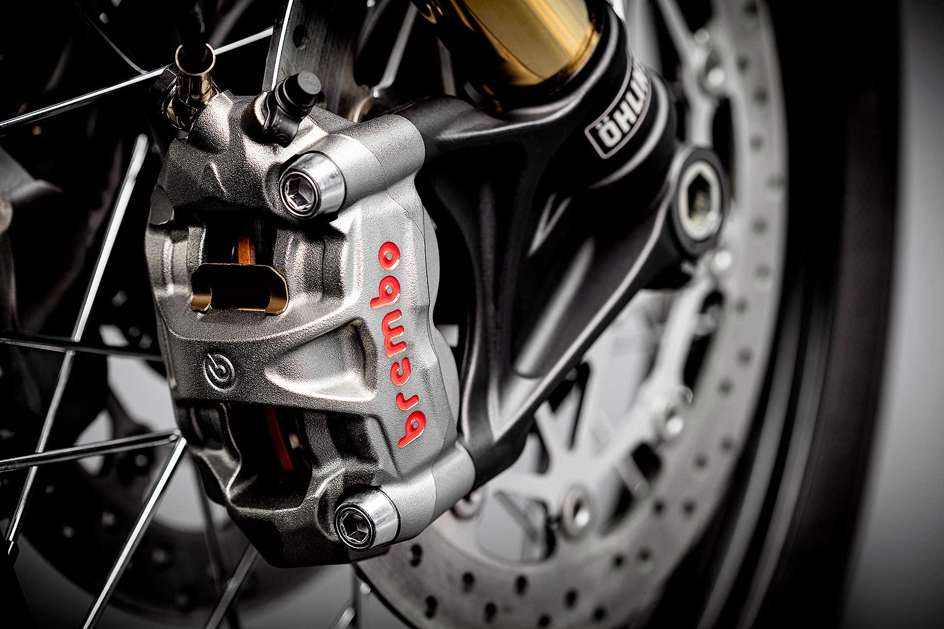 “Öhlins”. Basta la parola… Porta infatti la firma del marchio svedese l’impianto sospensioni, con forcella USD e ammortizzatore posteriore completamente regolabili nel precarico e nell’idraulica in compressione e ritorno. Salto di qualità anche per i freni, che all’anteriore esibiscono un doppio disco flottante con pinze Brembo M50 monoblocco e radiali, con quattro pistoncini. È Brembo anche il comando del freno, dotato di pompa radiale, regolabile sia nel rapporto di leva sia nella distanza dal manubrio. Regolazione comune anche al comando della frizione, dotato di torque assist per diminuire lo sforzo alla leva.