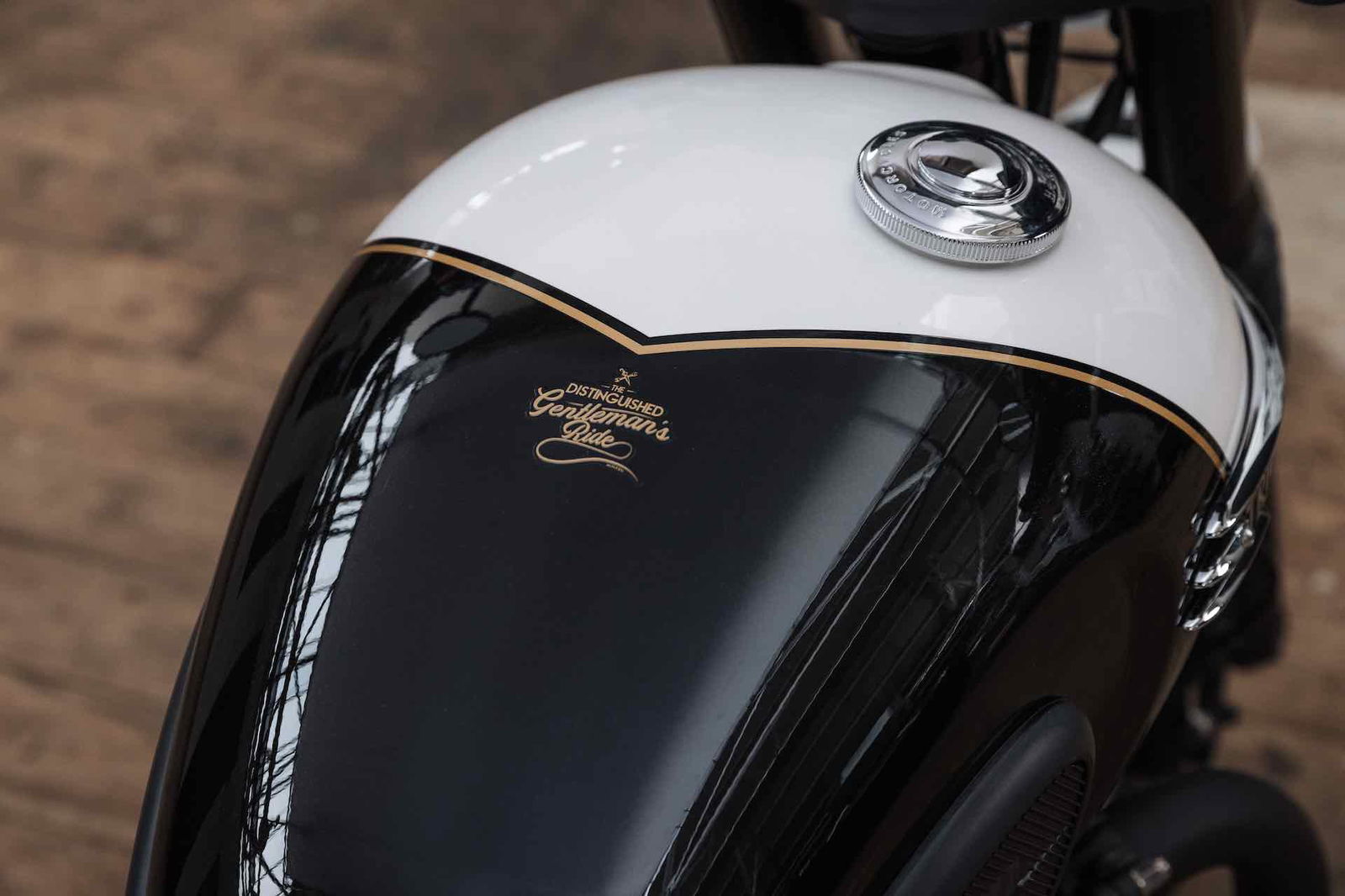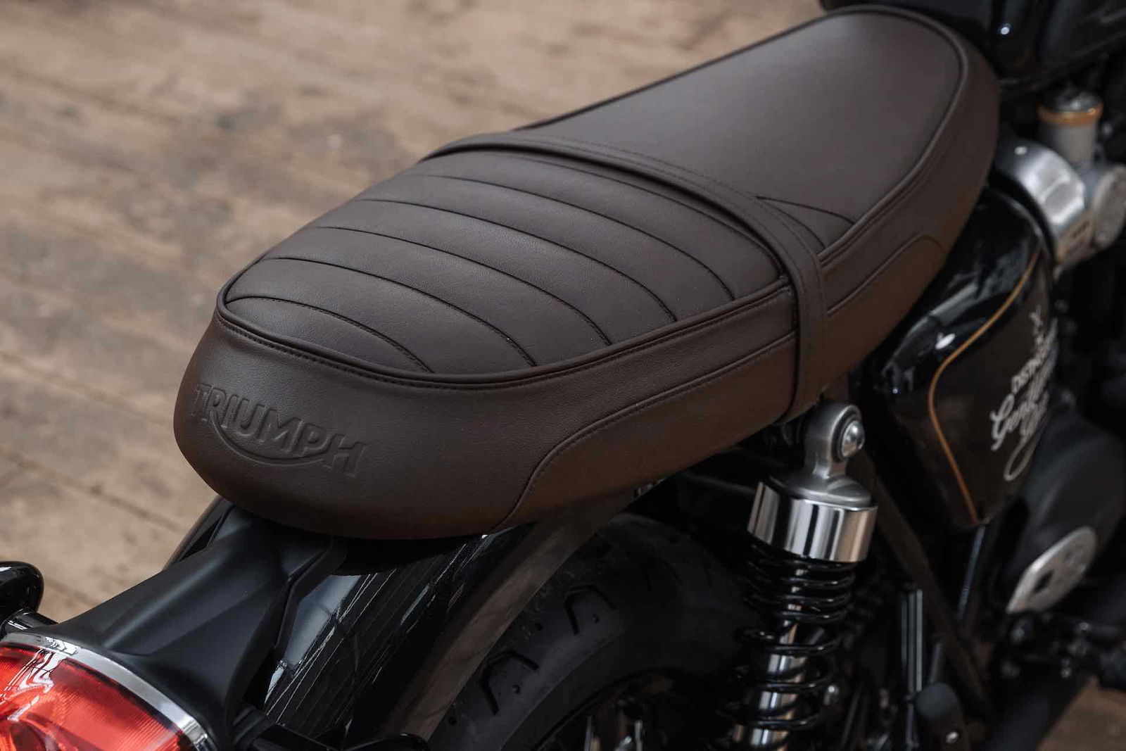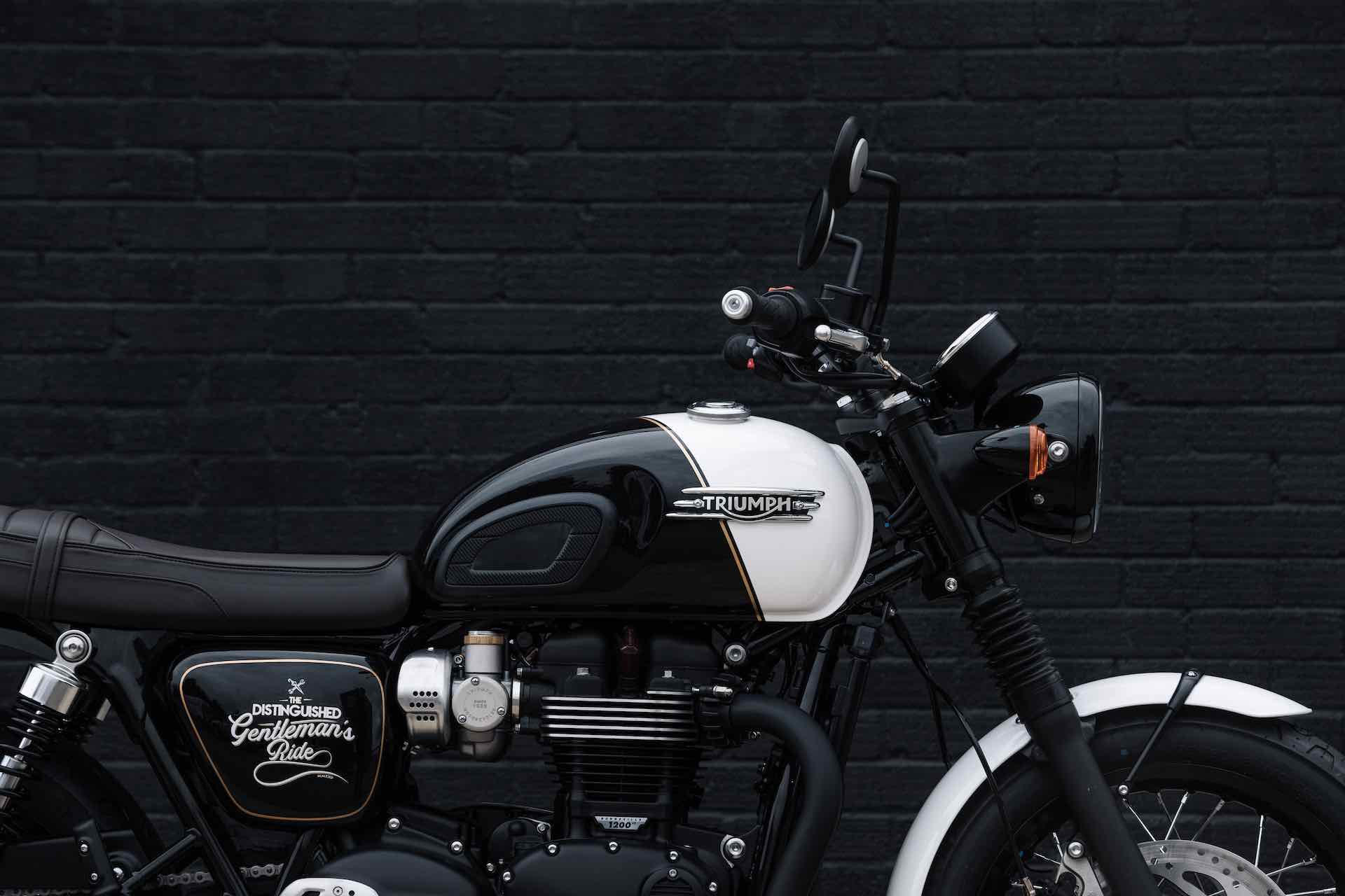 La Bonneville T120 Black DGR Limited Edition vanta uno schema cromatico esclusivo, dedicato alla The Distinguished Gentleman’s Ride. Un sofisticato abbinamento di Phantom Black metallizzato e Crystal White, per un risultato stilistico che simbolicamente richiama l’eleganza di un abito da sera. Ci sono preziose finiture dorate a impreziosire il serbatoio e filetti realizzati a mano a decorazione dei pannelli laterali. Il logo DGR 2023 con finitura dorata, campeggia sui pannelli laterali e serbatoio. Lo stile custom vintage è esaltato dalla sella di colore marrone, con cuciture tono su tono.