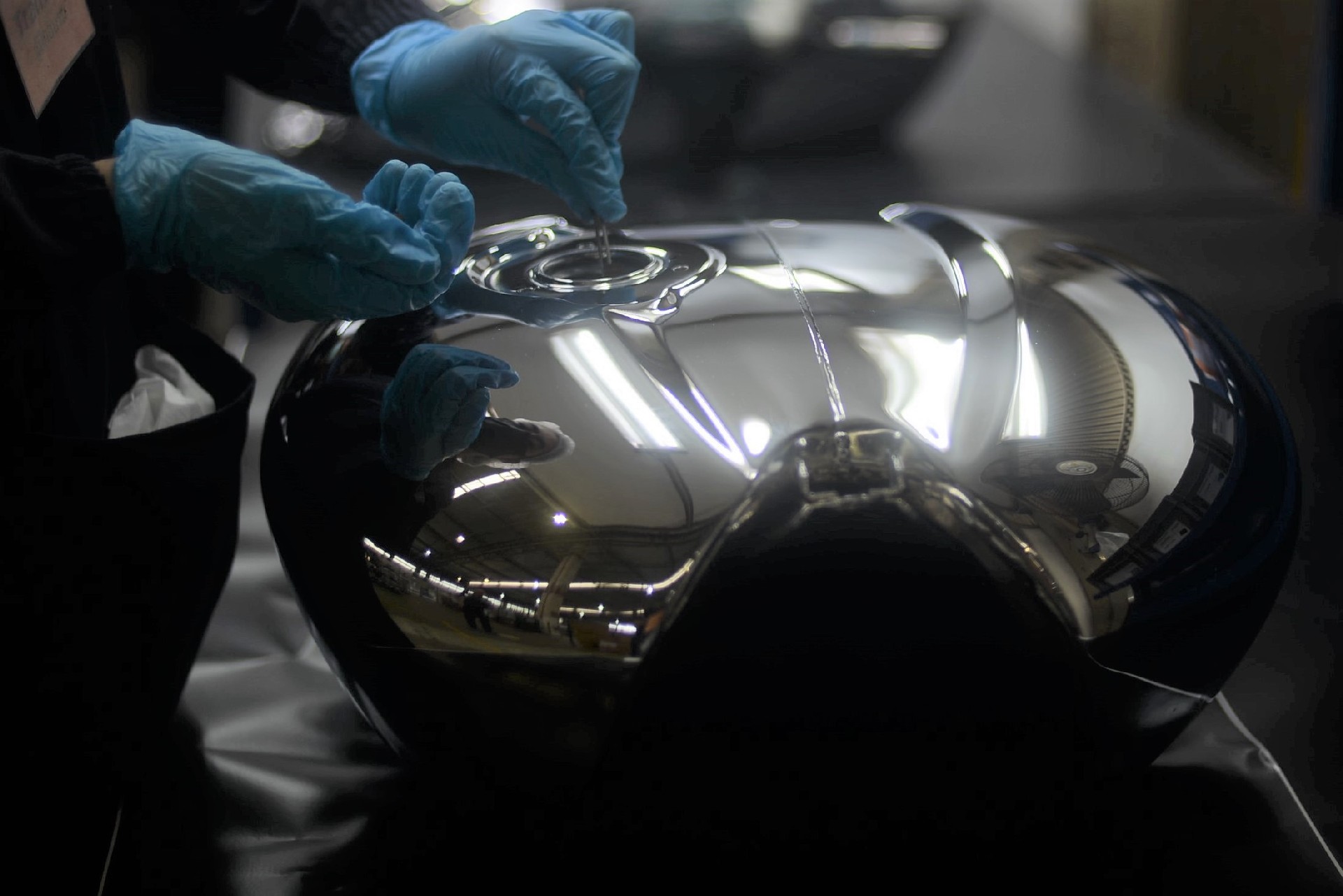 A questo punto gli artigiani del design department Triumph applicano a mano una mascheratura per passare un primer specifico, con una delicata verniciatura a spruzzo. Dopo la lucidatura manuale, i pezzi sono pronti per l’atto finale: l’ispezione di tecnici specializzati che con l’ausilio di faretti particolari esaminano ogni pezzo, alla ricerca della minima imperfezione. Le parti scartate finiscono nel processo green di riciclaggio, le altre hanno l’onore di essere montate sulle nuovissime Triumph Chrome Collection.