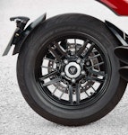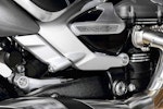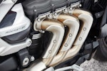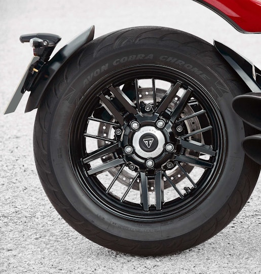 Se il reparto sospensioni è di una eccellenza scontata, con Showa che fornisce sia la forcella (USD a cartuccia, con steli da 47, completamente regolabile) così come il mono piggyback (anch’esso regolabile nel precarico e nell’idraulica, da remoto) montato in posizione laterale. I freni fanno scintillare gli occhi, in particolare il doppio disco anteriore con pinze Brembo M4.30 Stylema, monoblocco ad attacco radiale.Originale la scelta della dimensione delle ruote: 17″ davanti e 16″ dietro, entrambe con cerchi in lega a 20 razze e pneumatici Avon Cobra Chrome (il posteriore da 240 mm) espressamente sviluppati per la Rocket 3.
