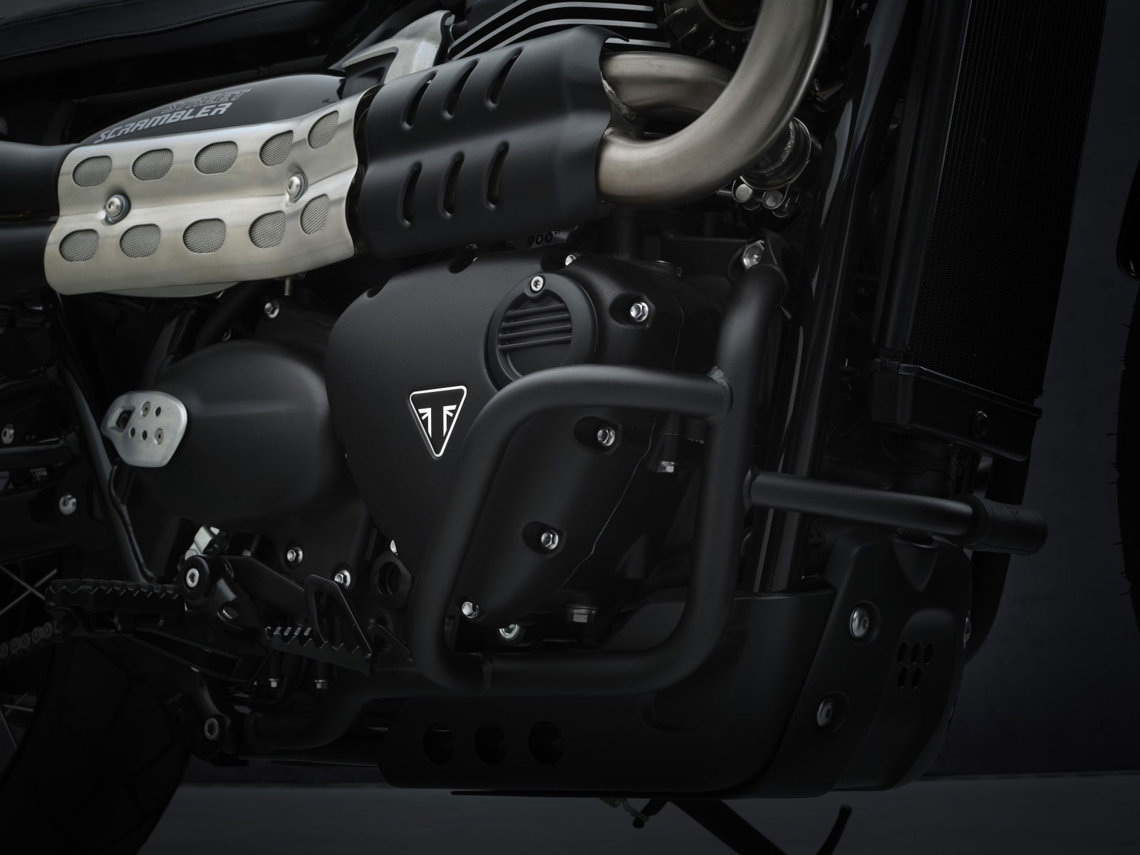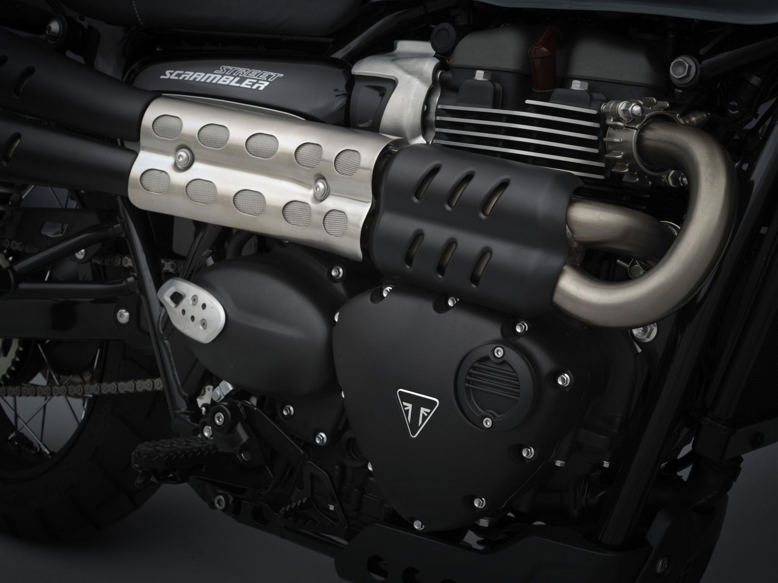 La Street Scrambler vede il suo storico bicilindrico Triumph omologato Euro 5. Operazione che però non ha portato ridimensionamenti in termini di performance. Il 900 cc “high-torque” raffreddato a liquido, eroga 65 CV di potenza a 7.250 giri/minuto e ha un picco di coppia di 80Nm a 3.250 giri/minuto. Il sound del twin è modulato dal doppio scarico in acciaio inox, montato in posizione rialzata. Altra caratteristica del bicilindrico in linea sono gli intervalli di manutenzione previsti ogni 16.000 km, garanzia di ridotti costi di gestione, e la disponibilità del kit di depotenziamento A2, che la rende adatta anche ai motociclisti alle prime armi.