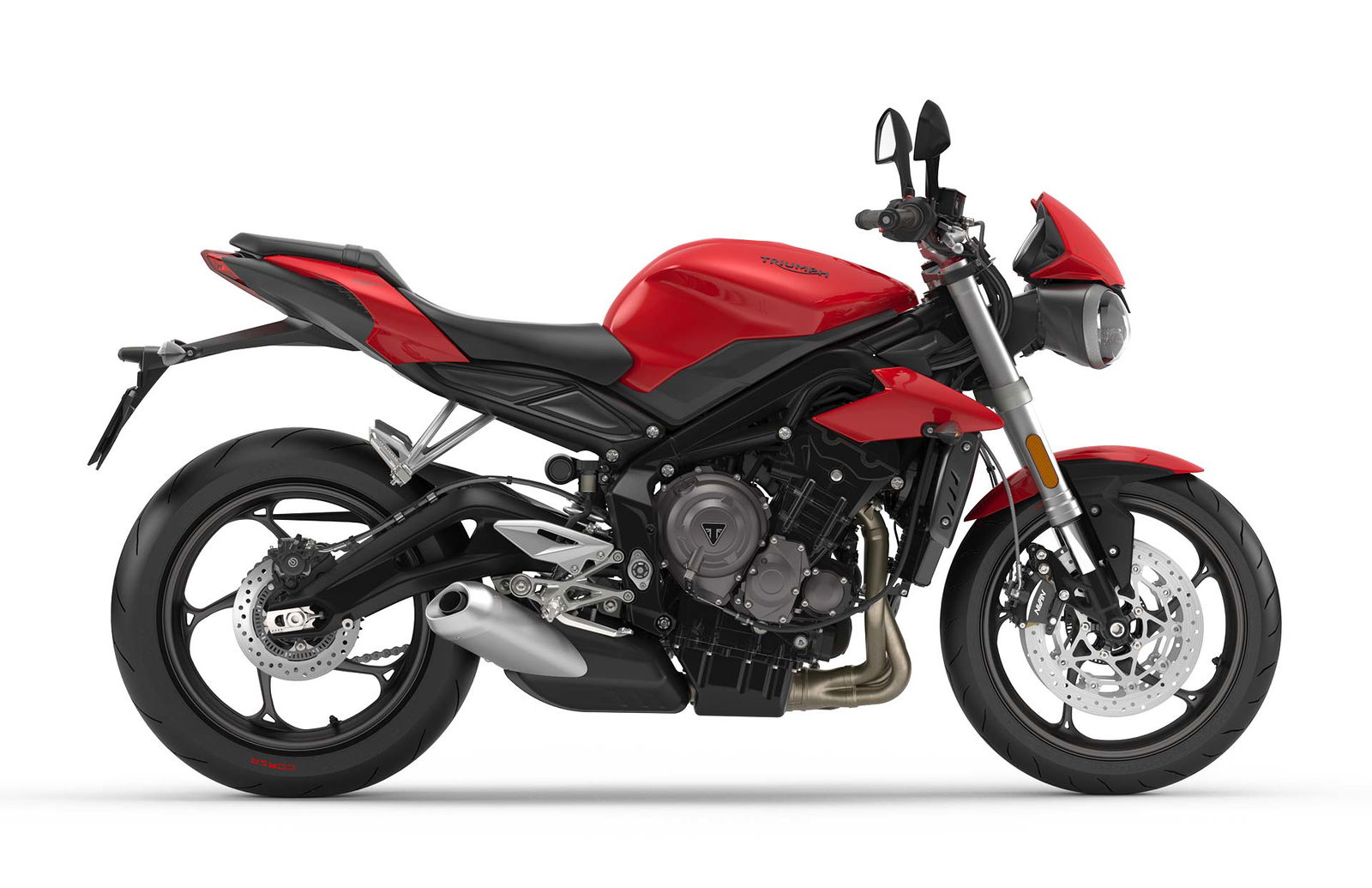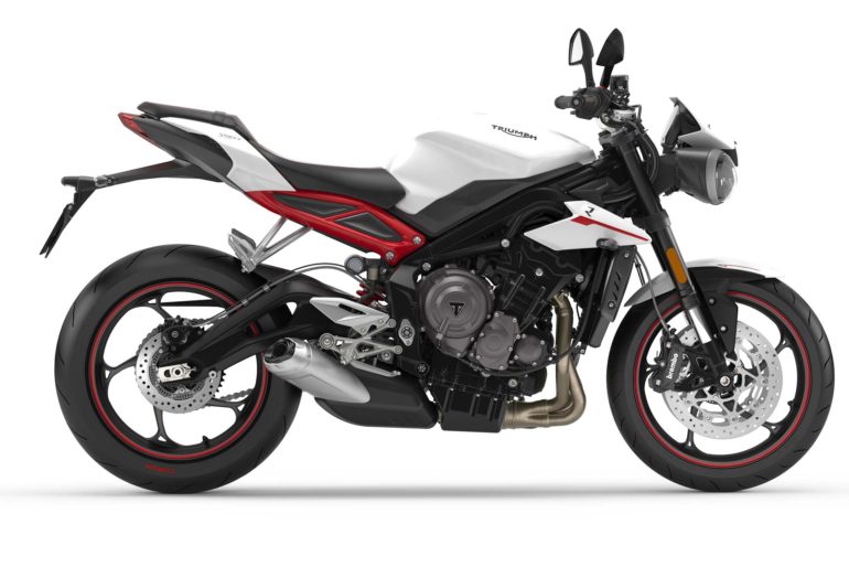 È la versione d’accesso, il motore tre cilindri da 765 cc ha un incremento di potenza del 6,6% rispetto al passato e ora è annunciato per 113 cv a 11.250 giri, la coppia sale del 7,3% nel suo picco massimo ora di 73 Nm a 9.100 giri. Il cambio è nuovo (comune alle altre versioni) prima e seconda marcia sono più corte per migliorare l’accelerazione. L’acceleratore, ovviamente elettronico, offre due modalità di guida Road e Rain, ciascuna integrante un differente livello del controllo di trazione. Optional il quickshifter. Telaio e forcellone sono abbinati a sospensioni Showa, la forcella con steli da 41 mm con regolazioni separate e il monoammortizzatore con precarico regolabile e serbatoio piggy back. Pinze Nissin per l’impianto frenante anteriore e Brembo per quello posteriore. La Street Triple S è anche quella con le quote ciclistiche più tranquille. Restando ferma la quota dell’interasse (1410 mm come l’edizione precedente) avancorsa e inclinazione cannotto sono dedicati a lei con 104,3 mm e 24,8°. L’altezza sella è di 810 mm, misure leggermente più “aperte” rispetto al passato, probabilmente dovute anche al fatto che la ciclistica della nuova Street si trova a gestire prestazioni maggiori. Di serie arriva con pneumatici Pirelli Diablo Rosso Corsa. Disponibile anche per patente A2 con motore portato a 660 cc.