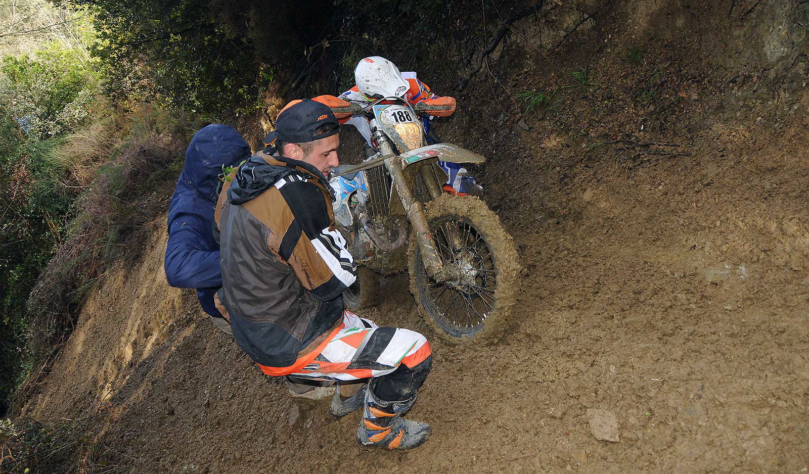 Cerco di non fermarmi, do gas, e la ruota dietro scava una fossa dove quasi sparisce mezza moto. Sono lì che cerco, inutilmente, di venirne fuori, la inclino e la impenno, quando arriva il pilota dietro di me, che mi vede, ma si infila anche lui nello stesso canale e ci rimane. Siamo in trappola e non c’è verso di uscirne da soli. Ad un certo punto lo guardo e gli faccio “senti facciamo una cosa, io aiuto te e tu aiuti me ad uscire”. Proviamo insieme a tirare fuori la sua moto, ma niente. Alla fine, mossi a compassione, ci danno una mano due spettatori, quindi in quattro riusciamo a liberare le moto dalla trappola di fango e a ripartire. Totale dell’operazione sei minuti! Quindi sul mio tempo in speciale stendiamo un velo pietoso..Purtroppo la pioggia caduta quasi incessantemente sulle meravigliose colline che circondano Montalcino durante il sabato, con incluse tre grandinate (!), e nel corso della notte di domenica, ha reso il percorso in certi tratti al limite della praticabilità. Sarebbe stata una gara bellissima e già piuttosto impegnativa se fosse stato asciutto. In queste condizioni il terreno è diventato veramente impegnativo, tant’è che al primo giro di gara la prova speciale in linea è stata annullata a causa del fondo che ha reso un tratto quasi impercorribile, bloccando dei concorrenti su una salita con conseguente “tappo” e quelli che sopraggiungevano tutti fermi ad aspettare.