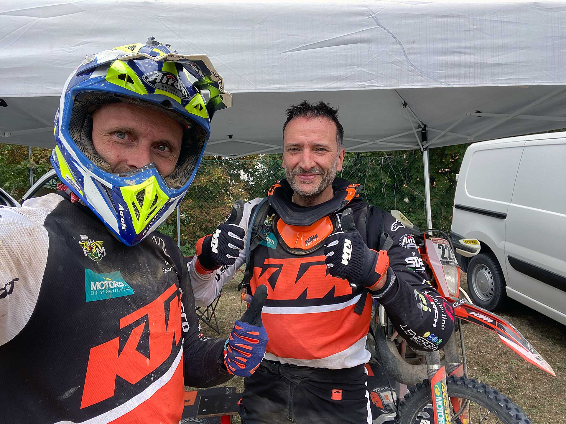 Ma veniamo al dunque: domenica mattina si sta da re, con circa 20 gradi, contro i 34 della prima gara, bel tempo e terreno asciutto. Giò Sala, che è sempre presente ed ha fatto la ricognizione del giro di gara il sabato, ci aveva avvisato: 50 km tutti fuoristrada, enduro vero, nulla di impossibile, intendiamoci, ma tecnici ed impegnativi a livello di concentrazione e… di braccia. Diciamo che per i meno allenati i tre giri previsti sarebbero potuti diventare lunghetti…e se lo dice il Giò c’è da fidarsi. Dopo un breve riscaldamento che ci evita di entrare in speciale a freddo, ci si trova subito al via della “linea” di enduro. Otto minuti dove alla fine le braccia diventano dure come due tronchi, ma una vera goduria in un saliscendi che alterna tratti scorrevoli e velocissimi, volendo giocarsi un bel pò di Jolly dal mazzo uno può anche pensare di fare un bel tempo, ma non è decisamente il mio caso…quindi l’ho presa con filosofia decisamente più vacanziera, una delle speciali più belle di sempre.Finita la PS1 ed anche le braccia, dentro in un bel bosco con altri dieci minuti di salita con un bel pò di scalini di roccia che gli avambracci se ne vanno del tutto. Il resto del giro è molto tecnico, con tanti tratti in single track stretti dove non ci si può proprio rilassare e qualche passaggio “inventato” tra i cespugli quasi da free ride. Prima di rientrare al paddock è la volta del cross test. Bè, ragazzi, il colpo d’occhio è da urlo, anzi da mondiale. Un prato in contropendenza con la traccia tra le fettucce bella rasata, e bello largo che ti viene solo voglia di dare tutto il gas che puoi. L’insidia c’è, ed è proprio la pendenza del praticello, che se non sei preciso a staccare e a tenere la linea giusta, ti ritrovi dieci metri più in giù del punto di corda. Ma bello da impazzire, roba che me lo sarei portato a casa! Fine primo giro, io e “F.Tortellino” facciamo assistenza alle moto e ci accorgiamo che il tempo sta un pò cambiando, mica verrà a piovere?!
