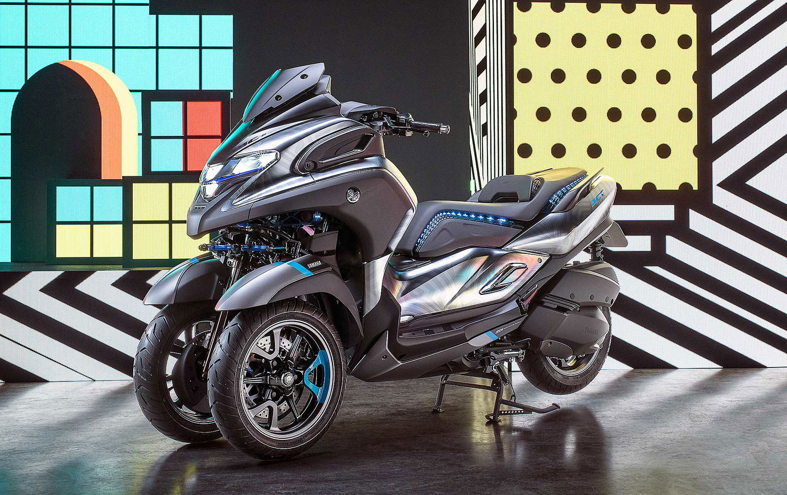 Yamaha ha già in listino una coppia di scooter a tre ruote, apprezzati dal pubblico per la loro leggerezza, soprattutto in mercati particolarmente sensibili alla sicurezza come la Francia. La coppia è formata dalle due versioni del Tricity, nelle cilindrate 125 e 155 . Il concept presentato all’EICMA è destinato ad ampliare l’offerta, offrendo maggiore versatilità grazie al motore monocilindrico 300 già protagonista sull’X-MAX e forte di prestazioni interessanti con i suoi 28 cv di potenza.Pacchetto tecnico completoI contenuti tecnici del tre ruote Yamaha 3CT sono particolarmente interessanti. E’ equipaggiato, infatti, con il sistema Tilt Lock Assist, per fermare lo scooter in posizione verticale nelle soste al semaforo, senza però bloccare la sospensione anteriore come avviene su alcuni modelli della concorrenza. La resa estetica è impreziosita dalla verniciatura metallizzata della carrozzeria, che crea un piacevole contrasto con i numerosi dettagli meccanici blu. La sella è stampata in 3D.