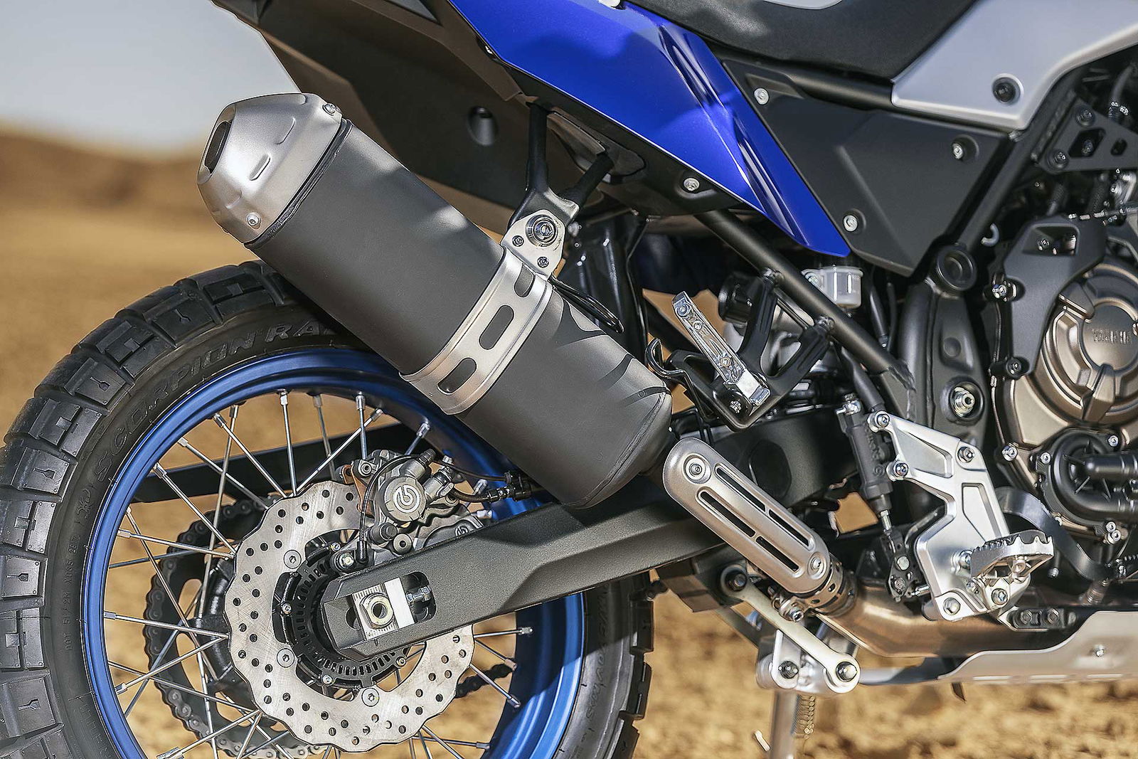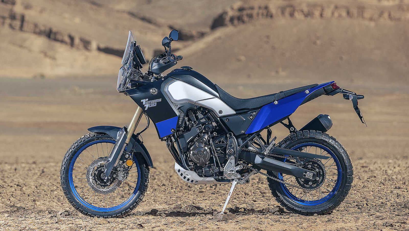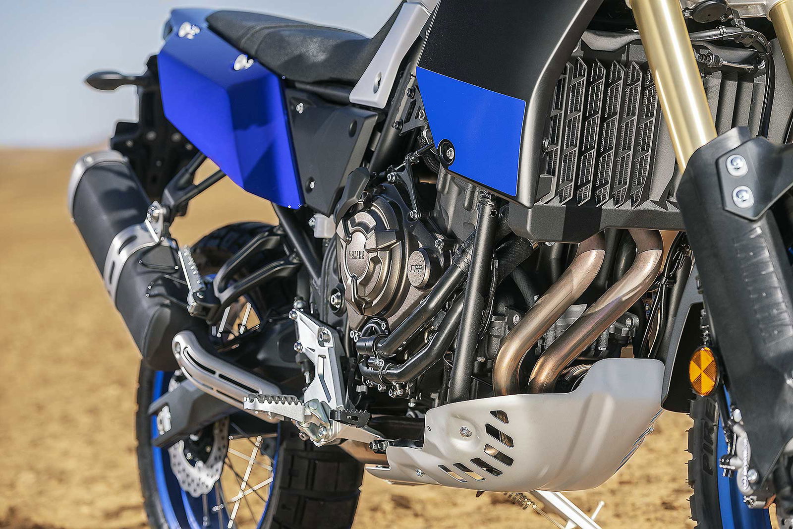 Il progetto parte dal telaio a doppia culla in acciaio che abbraccia il motore bicilindrico parallelo CP2 da 689 centimetri cubi. Il motore è derivato dalla MT-07 e già adottato con successo da Tracer e Tracer GT ed eroga 74,8 cavalli a 9.000 giri, con la coppia massima di 6,9 kgm a 6.500 giri.Sono le scelte della ciclistica a confermare l’intenzione di Yamaha Ténéré 700 di passare sopra ogni ostacolo, a partire dalla ruota anteriore da 21 pollici, misura fondamentale per affrontare l’offroad in modo professionale. La forcella rovesciata da 43 mm di diametro è regolabile in estensione, con escursione di 210 mm. La ruota posteriore da 18 pollici è vincolata al un ammortizzatore regolabile nel precarico della molla attraverso un registro remoto e ha un’escursione di 200 mm. L’impianto frenante con ABS disinseribile include una coppia di dischi anteriori a margherita da 282 mm con pinze Brembo e una unità da 245 mm al retrotreno.OLTRE GLI OSTACOLI