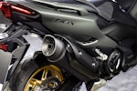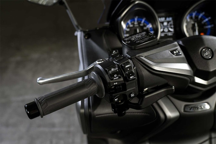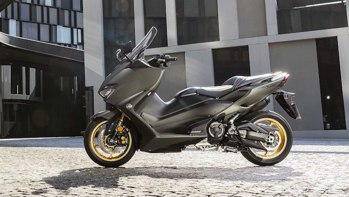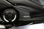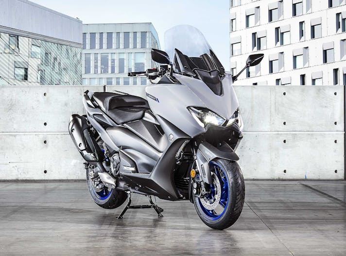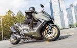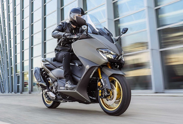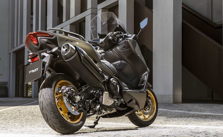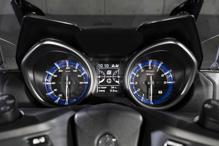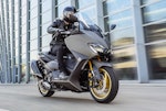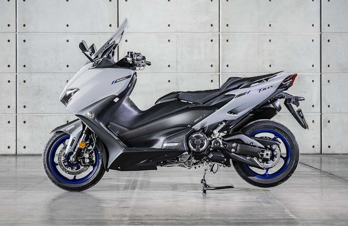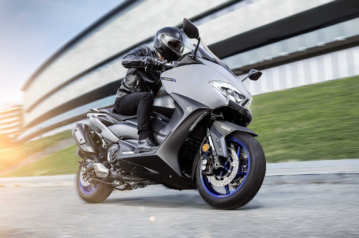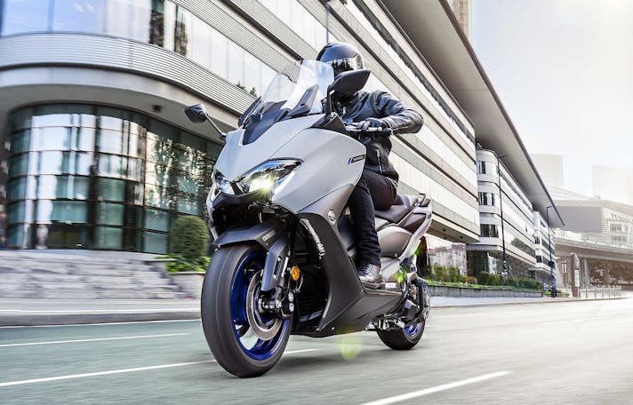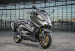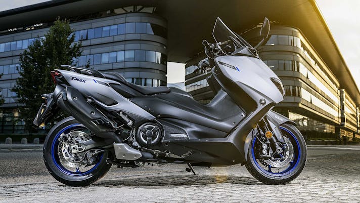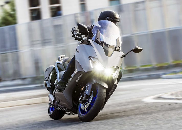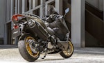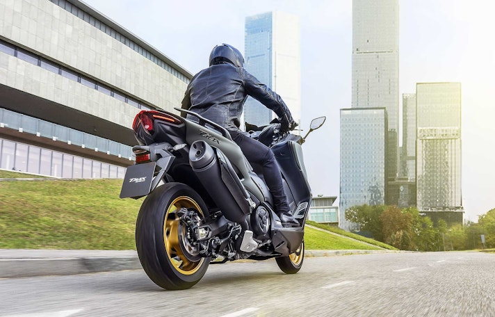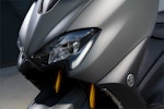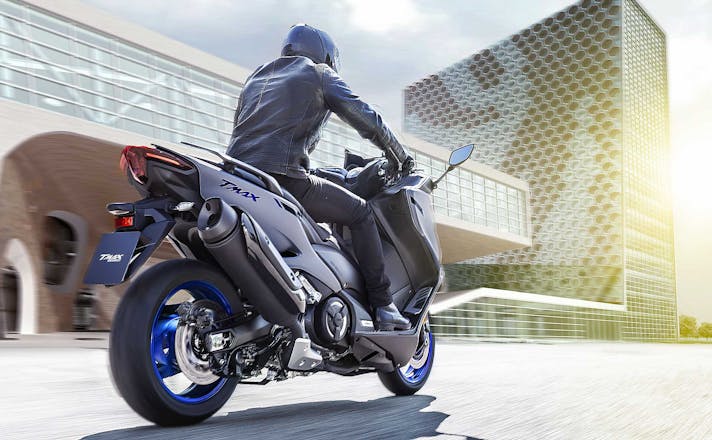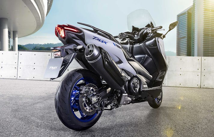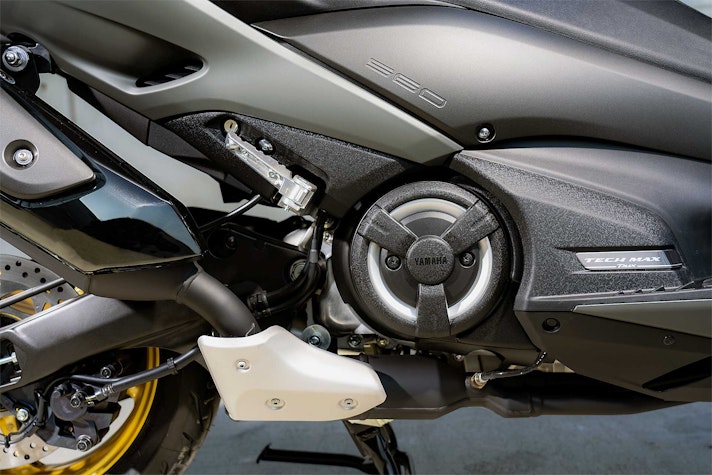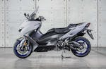 Aspirazione e scarico sono accordati per rendere il sound ancora più gasante in ogni fase della guida. Gli ingegneri hanno affinato anche la trasmissione a variazione continua, da sempre cavallo di battaglia del TMAX. Una nuova cinghia e una diversa messa a punto favoriscono gli scatti e portano il motore a girare più basso a velocità di crociera. La ciclistica promette un comportamento più preciso e rigoroso con nuovi settaggi per la forcella e per il monoammortizzatore, che ha il tipico schema Monocross.