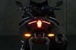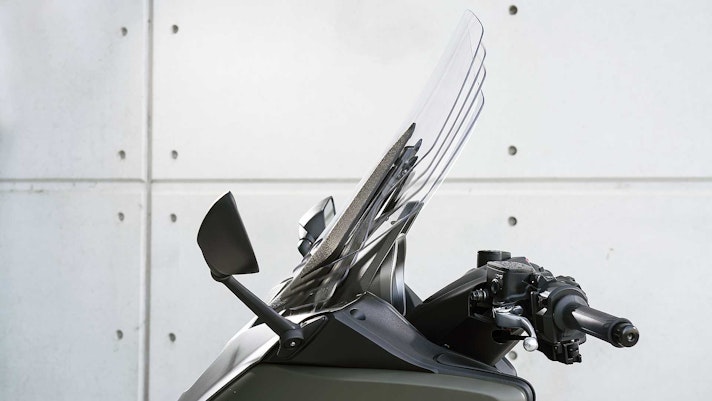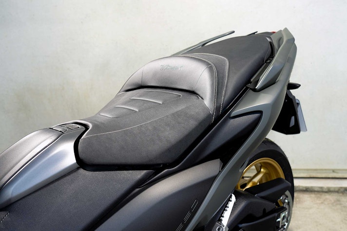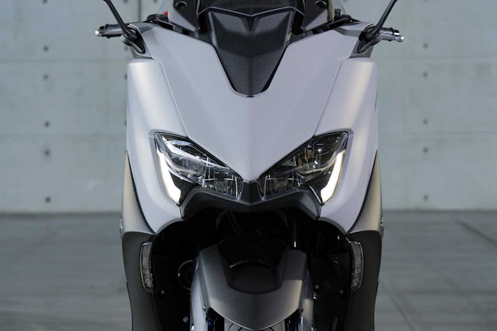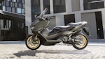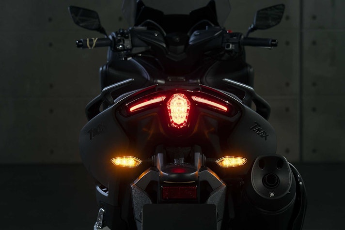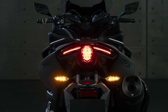 A livello estetico Il TMAX cambia più di quanto si potrebbe dire a un primo sguardo distratto. L’intera parte posteriore è rivista e ha un disegno più snello. La sagoma più affusolata permette al passeggero di salire e scendere meglio, oltre che di poggiare più comodamente i piedi sulle pedane. Il girovita più stretto non limita la capacità del vano sottosella, sempre in grado di accogliere un casco integrale o due caschi jet. Anche il resto delle sovrastrutture si concede un lifting e in pratica solo il cupolino e il puntale restano invariati.