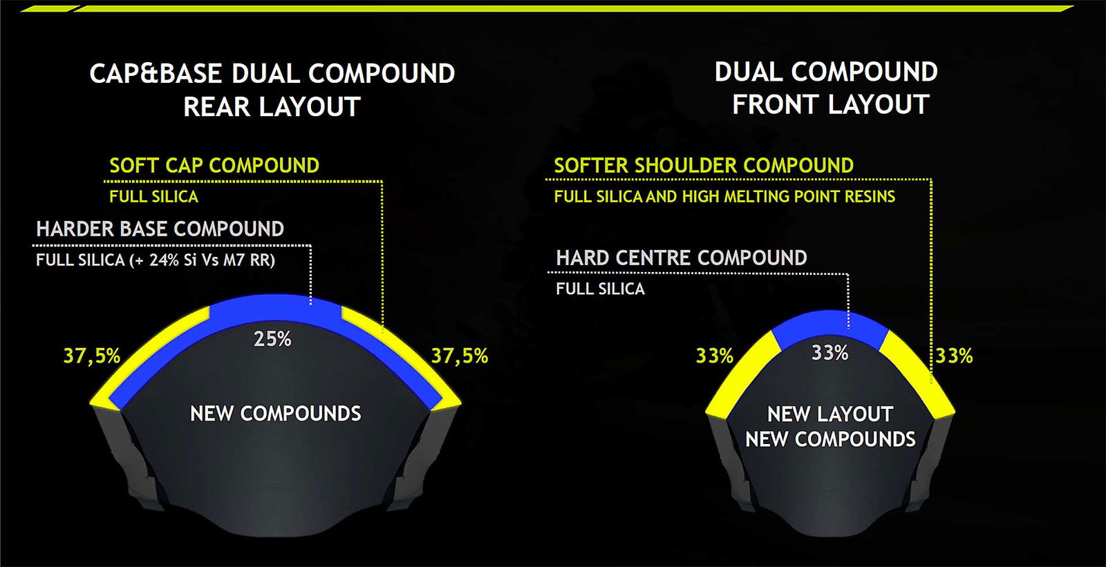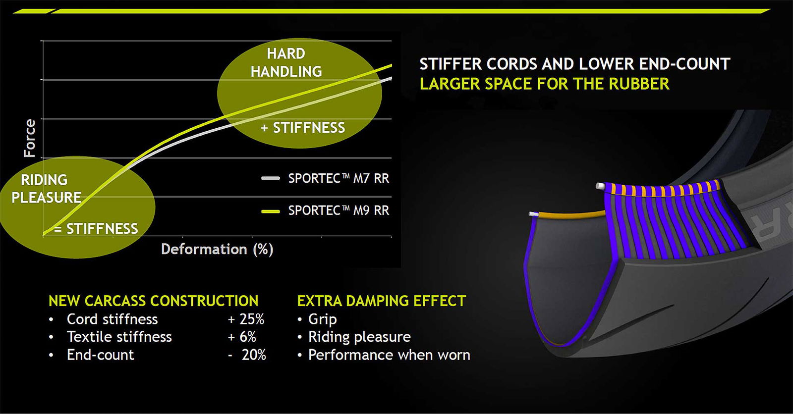 Secondo I tecnici Metzeler con le M9RR debutta una nuova generazione di bimescola. Le suddivisioni tra le mescole sono diverse tra anteriore e posteriore (33-33-33 per anteriore, 37,5-25-37,5 per il posteriore) e tutte le mescole sfruttano la silice per funzionare al meglio con freddo e bagnato. La tecnologia Cap & Base prevede che la mescola dura, presente al centro si infili sotto a quella morbida, ai lati, per migliorare la stabilità ed evitare discontinuità di comportamento, un fattore, questo a cui i tecnici Metzeler hanno dedicato particolare attenzione. A cambiare è anche la struttura della carcassa, confermata come detto la cintura in acciaio a zero gradi, sono invece nuove le tele trasversali che prevedono filamenti di Kevlar più rigidi (si parla del 25 %) ma più distanziati tra loro (come se ci fosse un pettine con denti più lontani), una soluzione scelta per migliorare il sostegno senza penalizzare il comfort.
