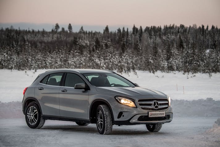 Bridgestone Blizzak LM005 Mercedes GLA 4MaticSe a tutto ciò aggiungete un peso in ordine di marcia che supera i 1.500 kg e un passo relativamente corto, ecco che la GTE ha tutte le carte in regola per mettere in crisi le Bridgestone. E invece: salite, anche con pendenza elevata, non mettono in crisi la motricità. Solo sui tornanti stretti bisogna insistere un po’ con il gas e lavorare di volante per trarsi d’impaccio. Ma a stupirmi è soprattutto la direzionalità: le ruote anteriori impiegano veramente poco a trovare il giusto grip e, un istante dopo, sono seguite dalle posteriori. Tanta sicurezza anche in frenata, l’unico modo per capire quanto grip c’è davvero sulla neve. L’ABS entra in fretta, come è logico, ma modulando con attenzione il pedale centrale si ottengono spazi d’arresto lusinghieri, pure nel classico “panic-stop”. Lo stesso accade in discesa, anche se va ricordato che, sulla neve, le distanze di sicurezza devono giocoforza aumentare.