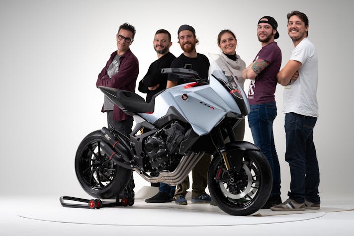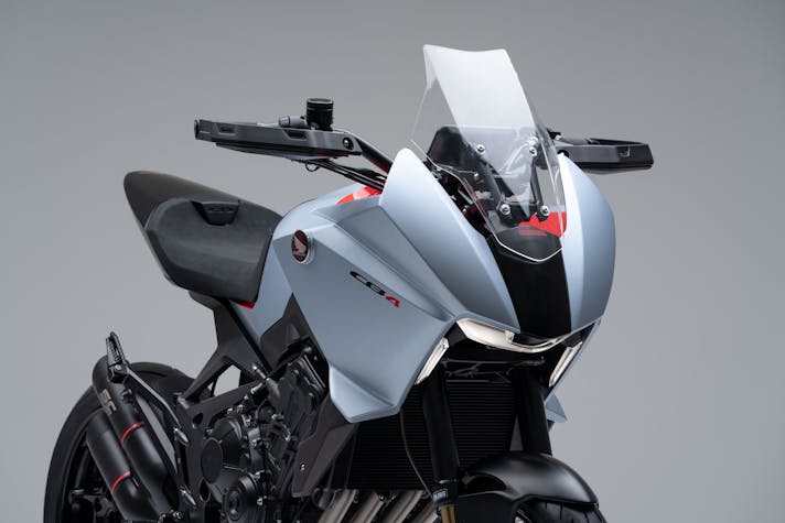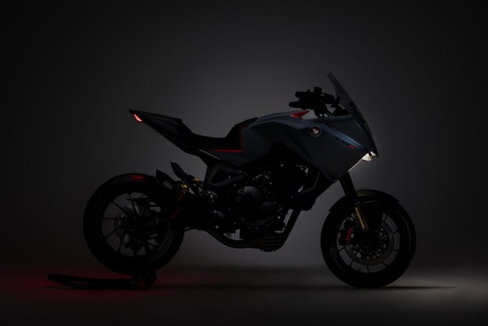 La carrozzeria della Honda CB4 X Concept lascia in bella vista il motore ereditato dalla CB650R. Il quattro cilindri qui è abbinato a un grintoso silenziatore sdoppiato realizzato da SC Project, che con la sua forma a canne mozze lascia scoperto il cerchio, sul lato opposto al forcellone monobraccio. Le ruote sono entrambe da 17 pollici a ribadire una chiara vocazione stradale. Al momento è presto per dire se da questo mezzo deriverà poi un modello di serie, ma sognare non costa nulla.
