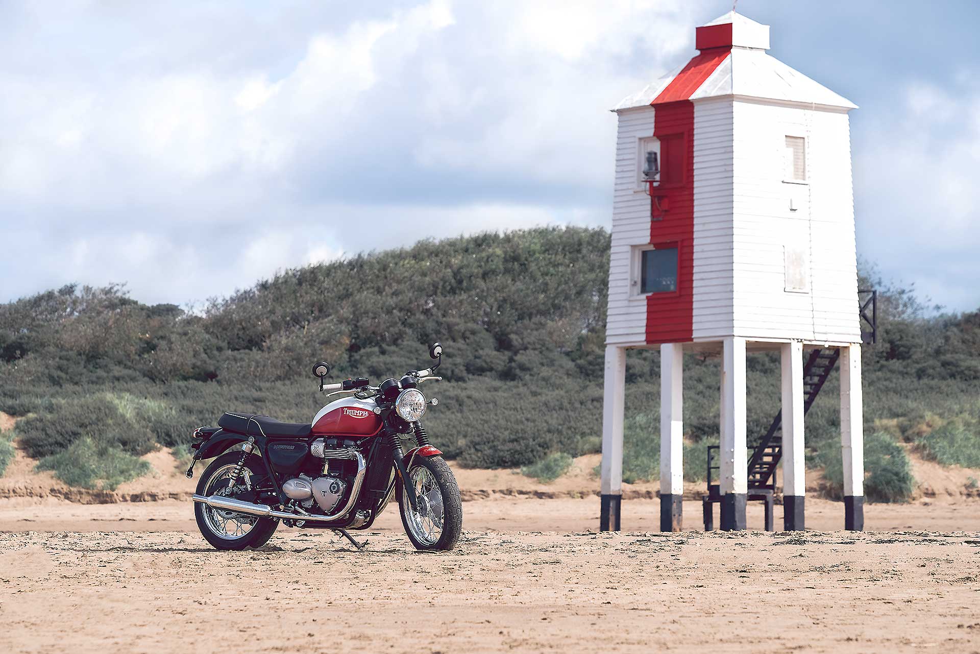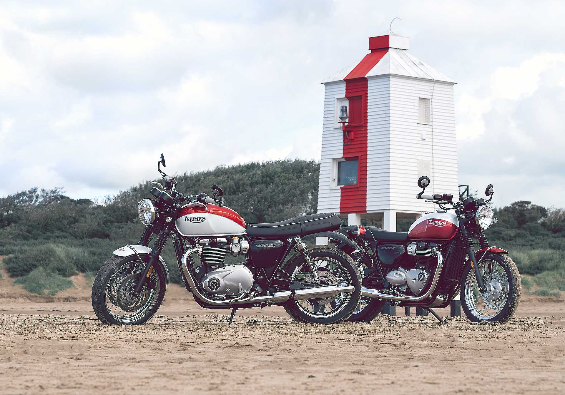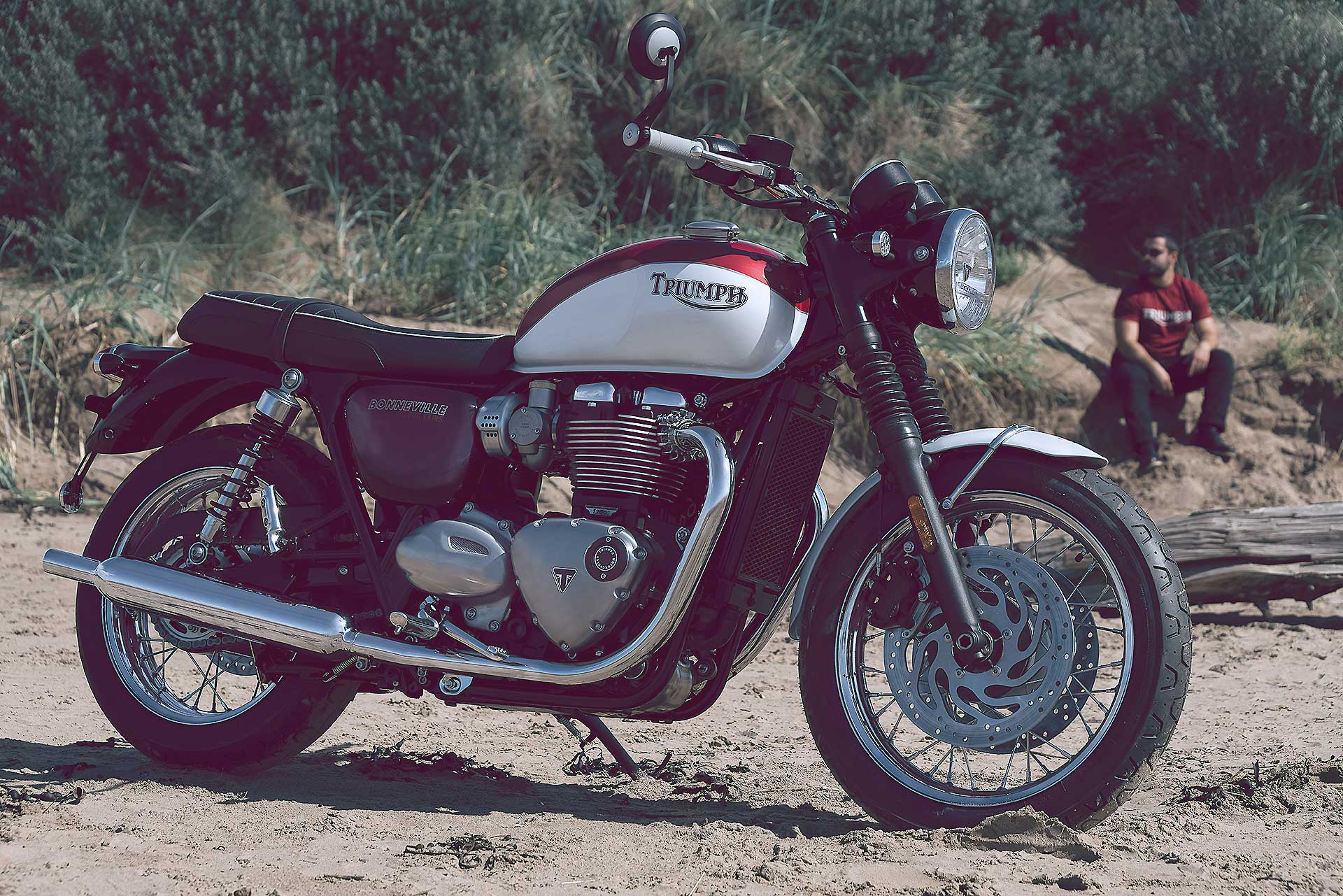 Per rendere omaggio a questo personaggio, Triumph ha deciso di dedicargli la più classica delle sue Modern Classic: la Bonneville, in entrambe le versioni T100 e T120 (motore da 900 cc con 55 cv la prima e 1.200 cc con 80 cv la seconda). A differenziare questa edizione speciale sono la verniciatura bicolore con filetti dipinti a mano, il vecchio logo Triumph (che compare per la prima volta sul serbatoio di un modello attuale), i fianchetti dedicati e lo storico “flying globe“, il logo che Bud Ekins utilizzò per la sua concessionaria di Sherman Oaks, che campeggia su serbatoio e parafango.