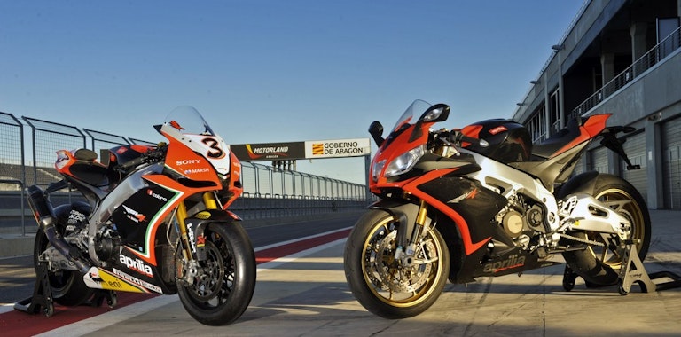In sella, in un sol colpo, alla moto campione del mondo Superbike e alla sua “derivata” Aprilia RSV4 Factory ABS, ultima evoluzione di una stirpe vincente