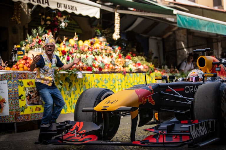 Da un box fuori dagli schemi, nel bel mezzo del mercato di Ballarò, al porto di Mondello. Max Verstappen sfreccia fra le strade di Palermo a bordo della sua Red Bull Honda, cominciando un viaggio che lo porterà fino a Monza, dove si svolgerà il GP di Formula 1.