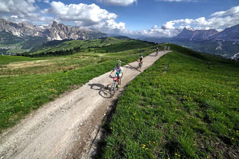 70 itinerari da affrontare in Mtb ed e-Mtb al cospetto delle magnifiche Dolomiti di Val Gardena, Alpe di Siusi, Alta Badia, Arabba e Val di Fassa.