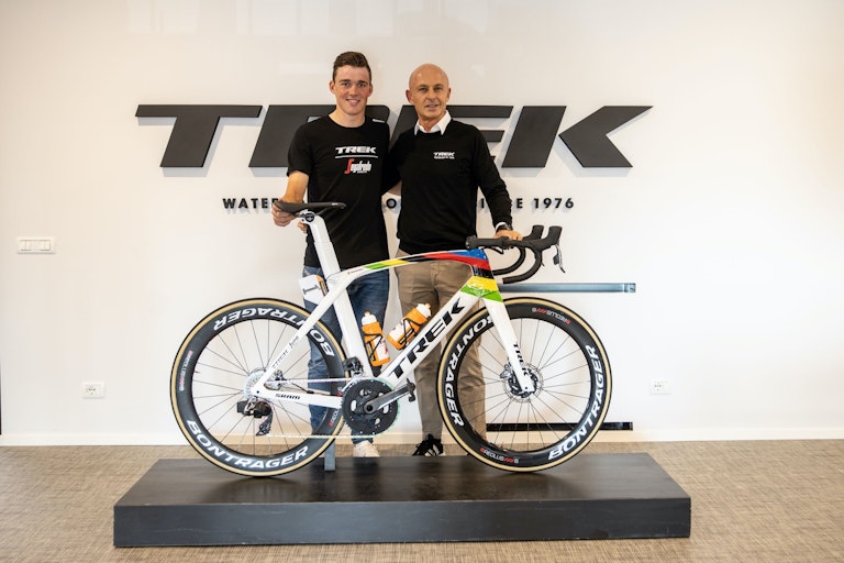 La filiale italiana Trek inaugura la nuova sede, a Bergamo: un atelier della bicicletta, festeggiato da atleti come il campione del mondo Mads Pedersen