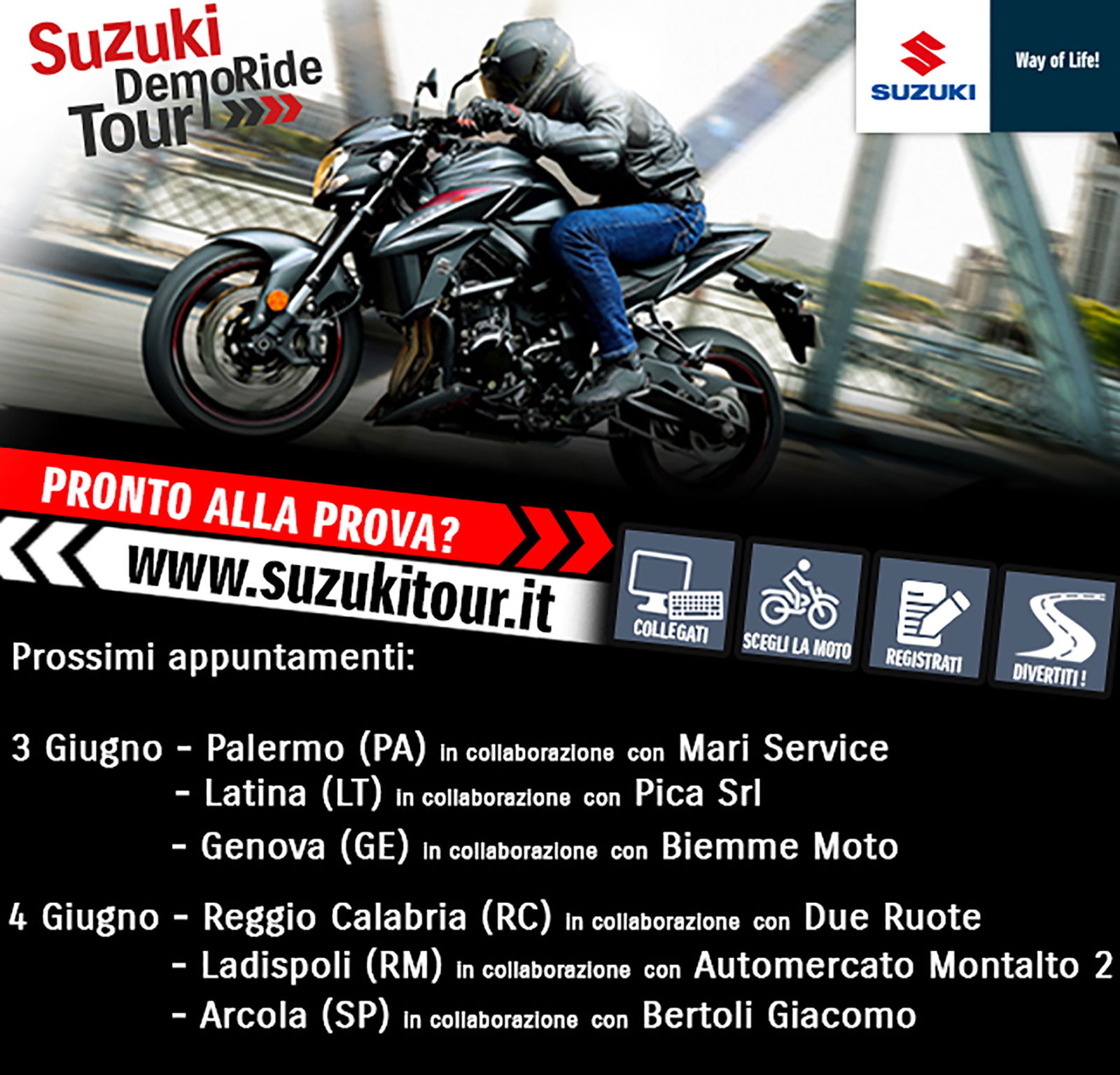 DOVE E QUANDO: varie località, 3 e 4 giugnoIl Suzuki DemoRide Tour inaugura il mese di giugno con nuovi appuntamenti in calendario per far conoscere e provare la gamma Suzuki e, soprattutto, i suoi nuovi modelli come V-Strom 650 e 1000 e le naked SV650, la GSX-S750. I test ride, della durata di circa 30 minuti nelle fasce orarie tra le 9.30 e le 19, si svolgono con l’assistenza dello staff Suzuki e questo fine settimana si svolgeranno a Palermo, Latina, Genova, Reggio Calabria, Ladispoli (RM) e Arcola (SP). Per prenotare la prova è sufficiente iscriversi on line, scegliendo data, luogo e modello.COSA: CIRCUITO E-ENDURO SPECIALIZED, l’ultima frazione si pedala nel cuore del borgo medievale di Massa Marittima