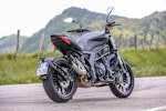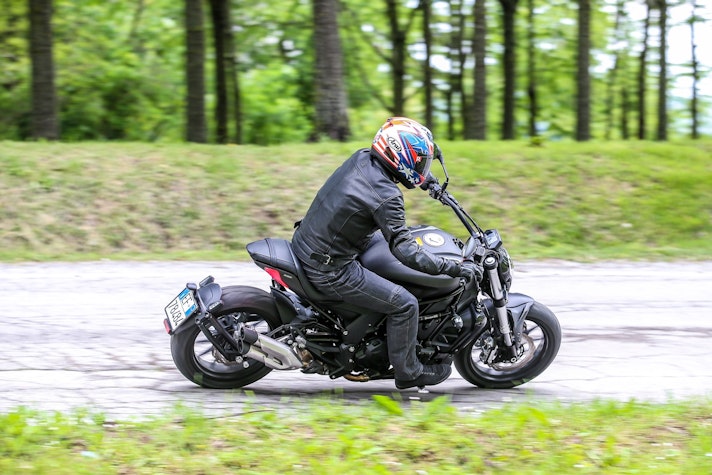 Il serbatoio da 21 litri, punto centrale del design, è appoggiato al telaio a traliccio in tubi di acciaio, a sua volta completato dal lungo forcellone. L’autonomia dichiarata è di oltre 500 chilometri, realistica considerati i consumi contenuti del bicilindrico in linea, che raggiunge la potenza massima di 47,6 cv (35 kW, ossia il limite per la guida con patente A2) a 8500 giri/min, con la curva di coppia che tocca il picco di 46 Nm a 6000 giri.L’impianto frenante, prodotto da una consociata del gruppo cinese che è proprietario della Benelli, si avvale di una coppia di dischi anteriori semi-flottanti di 280 mm di diametro con pinze a 4 pistoncini, mentre dietro il disco è di 240 mm con pinza a due pistoncini. La frizione multidisco in bagno d’olio viene azionata da una leva non regolabile nella distanza dalla manopola, al contrario di quella del freno anteriore. Le sospensioni sono incentrate sulla forcella con steli di 41 mm di diametro non regolabile e sul monoammortizzatore, personalizzabile nel solo precarico della molla.I materiali e l’assemblaggio sono ispirati alla funzionalità, come è normale che sia visto il prezzo finale, ma il motociclista che acquisterà la 502C non rimarrà deluso. Il colpo d’occhio è gratificante, per merito di finiture migliori di quanto il prezzo farebbe immaginare. Peccato per la misura 160/60 della copertura posteriore Pirelli Angel ST: con un 180 o un 200 mm l’impatto estetico sarebbe stato ben più appagante, senza reali conseguenze sulla maneggevolezza.