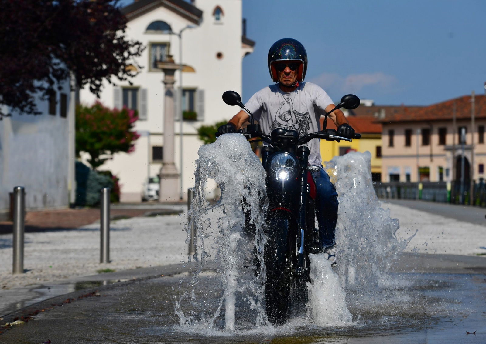 Una giornata torrida, di quelle in cui anche girare in moto è faticoso. Sotto il casco la testa bolle e i pensieri si popolano di immagini sotto zero, con i colori del gelato e la consistenza della granita. Ma già dieci minuti dopo la prima sosta, al gusto di mandarino, la canicola è tornata a contorcere i ragionamenti e mi ha fatto cadere vittima del più classico dei miraggi: la fonte zampillante… Nemmeno il tempo di valutare la situazione che, come un Mosè a motore, la stavo attraversando bagnato fino all’ombelico. Zuppo ma fresco, per tutto il resto del giro, che da lì in poi si è fatto anche interessante in quanto a piacere di guida. Saliscendi nel bosco, qualche divertente infilata di curve, sterrate polverose in mezzo a campi di mais e di girasole dalla testa enorme.