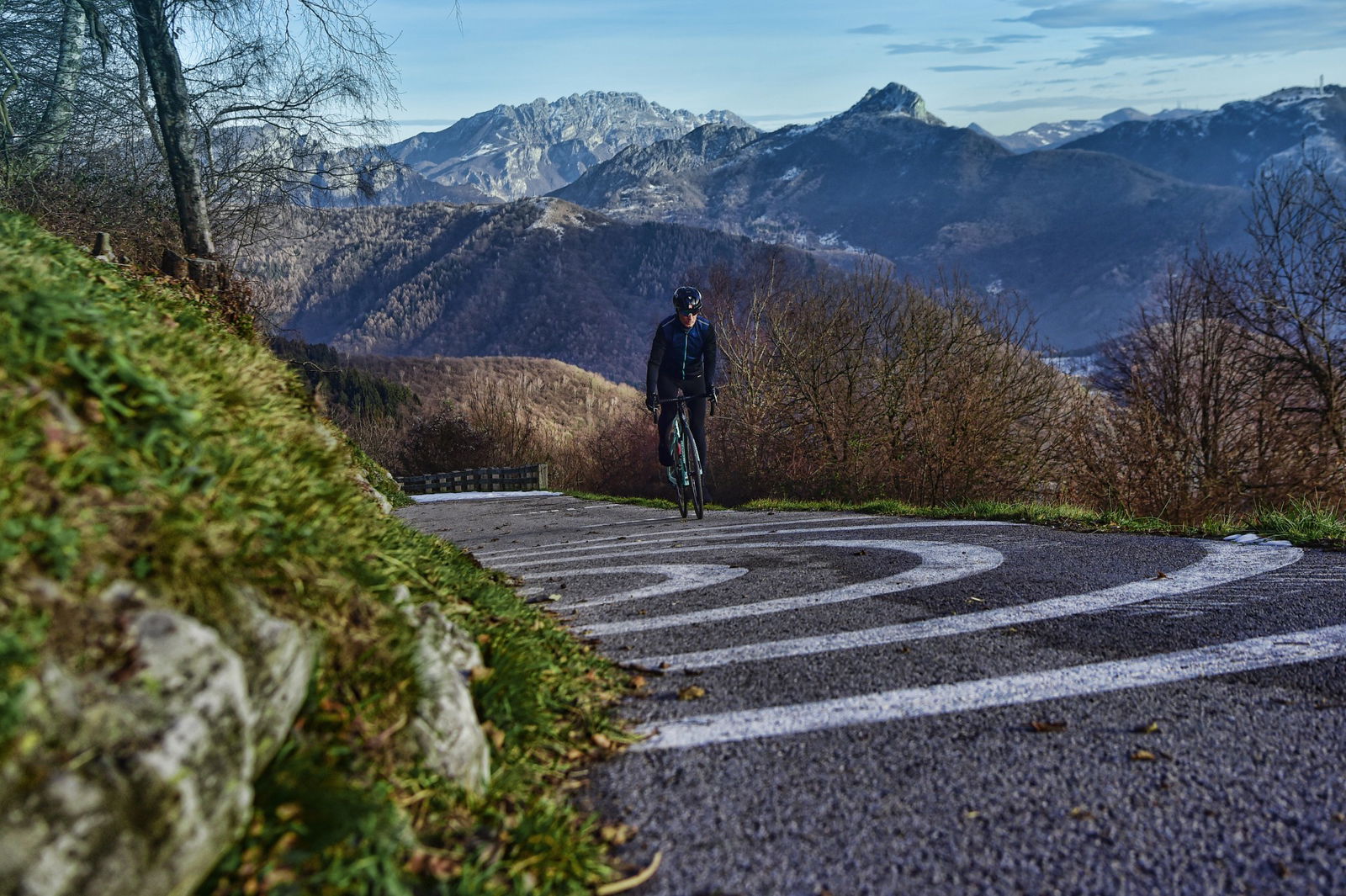 Una pressione sul pulsante posto sul tubo orizzontale, dietro l’attacco manubrio, e il motore si accende. Siamo in modalità Eco (garantisce il 30% di assistenza, 60% lo dà il Comfort e 100% il Power); già così l’inerzia di cui parlavo prima diventa uno sfumato ricordo. Non vuole dire che non si faccia fatica, anzi… Diciamo che a parità di fatica si sale più veloci, riuscendo a mantenere una cadenza più naturale. Salgo senza affanno, mi guardo intorno, saluto gli asini che si incontrano sul primo traverso, quando la strada piega verso sinistra. Vivo con spirito nuovo il susseguirsi della misurazione dipinta sull’asfalto, che segna metro per metro il dislivello superato dalla partenza: se la volta precedente era nel contempo stimolo e calvario, ora non vi presto quasi attenzione. Al contrario, riesco a leggere con lucidità l’elenco in stampatello bianco di nomi e tempi che meritano di essere ricordati e le frasi di chi ha descritto l’ascesa; seguo i profili delle montagne all’orizzonte: Cornizzolo, Corni di Canzo, Resegone, Grigna, Grignetta… Pedalo fluido, sfruttando il costante e lineare supporto del motore. Ogni tanto scalo un pignone e mi alzo sui pedali, l’Aria mi asseconda pronta. Mi permetto addirittura di tagliare il primo, terribile, tornantino (qui l’ultima volta mi ero quasi fermato con il cuore in gola) e per tenere giù la ruota anteriore faccio slittare quella posteriore. Poi mi godo tutto lo scenario che una giornata tersa e frizzante mi regala verso Nord-Est e in una manciata di secondi sono già al secondo e ultimo tornante, pronto a superare anche il rettilineo finale e raggiungere la sommità del Muro.