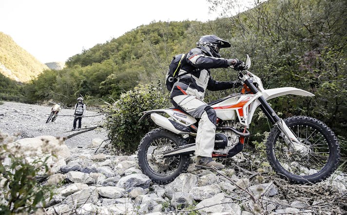 La Beta RR 350 è l’unica del nostro confronto con questa cilindrata: 350 centimetri cubi perché la casa toscana parte da questa cubatura che però sia ben chiaro sta di diritto nella categoria perché riconosciuta anche nel campionato mondiale enduro: le 250 quattro tempi e le 350 corrono insieme.Telaio in acciaio al cromo-molibdeno, sospensioni completamente regolabili della ZF con forcella da 48 mm di diametro e mono ammortizzatore con leveraggio progressivo. Interasse da 1.490 mm escursione della ruota anteriore di 295 mm e posteriore di 290; disco da 260 mm con pinza flottante e dietro da 240 mm. Il motore a iniezione elettronica a quattro valvole in titanio, il serbatoio da 9 litri e il peso dichiarato è di 107,5 kg a secco con la sella alta 940 mm.