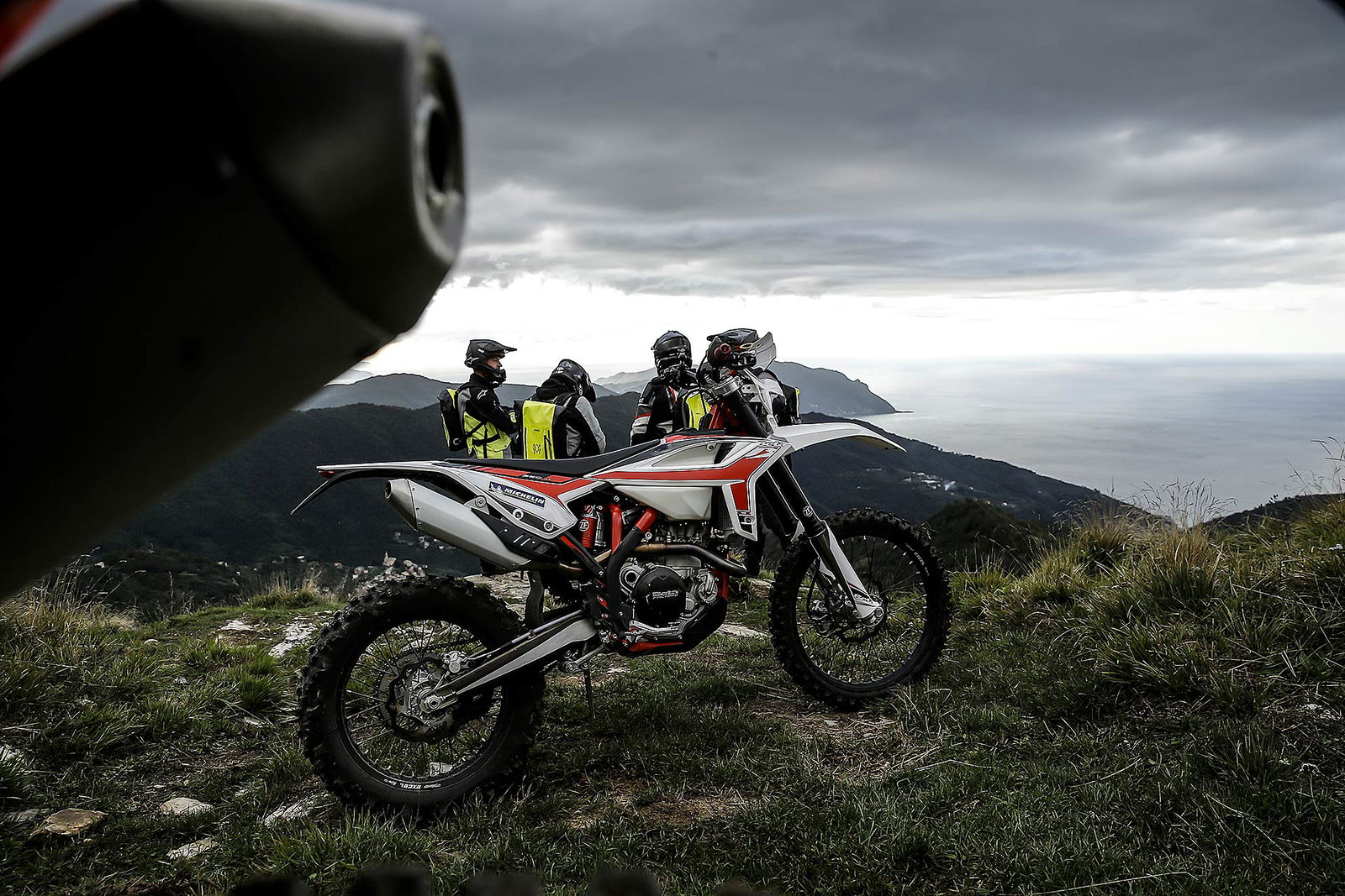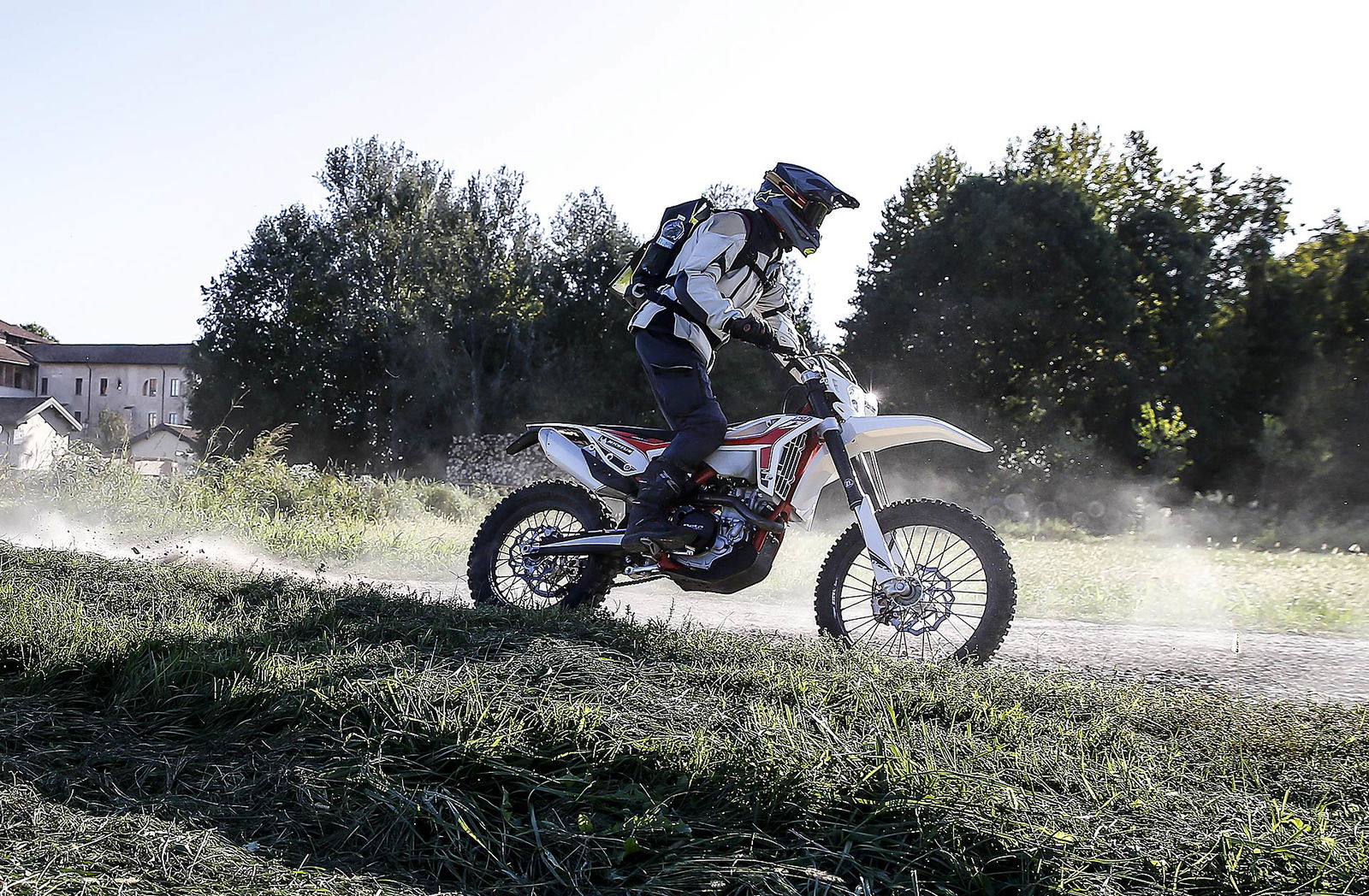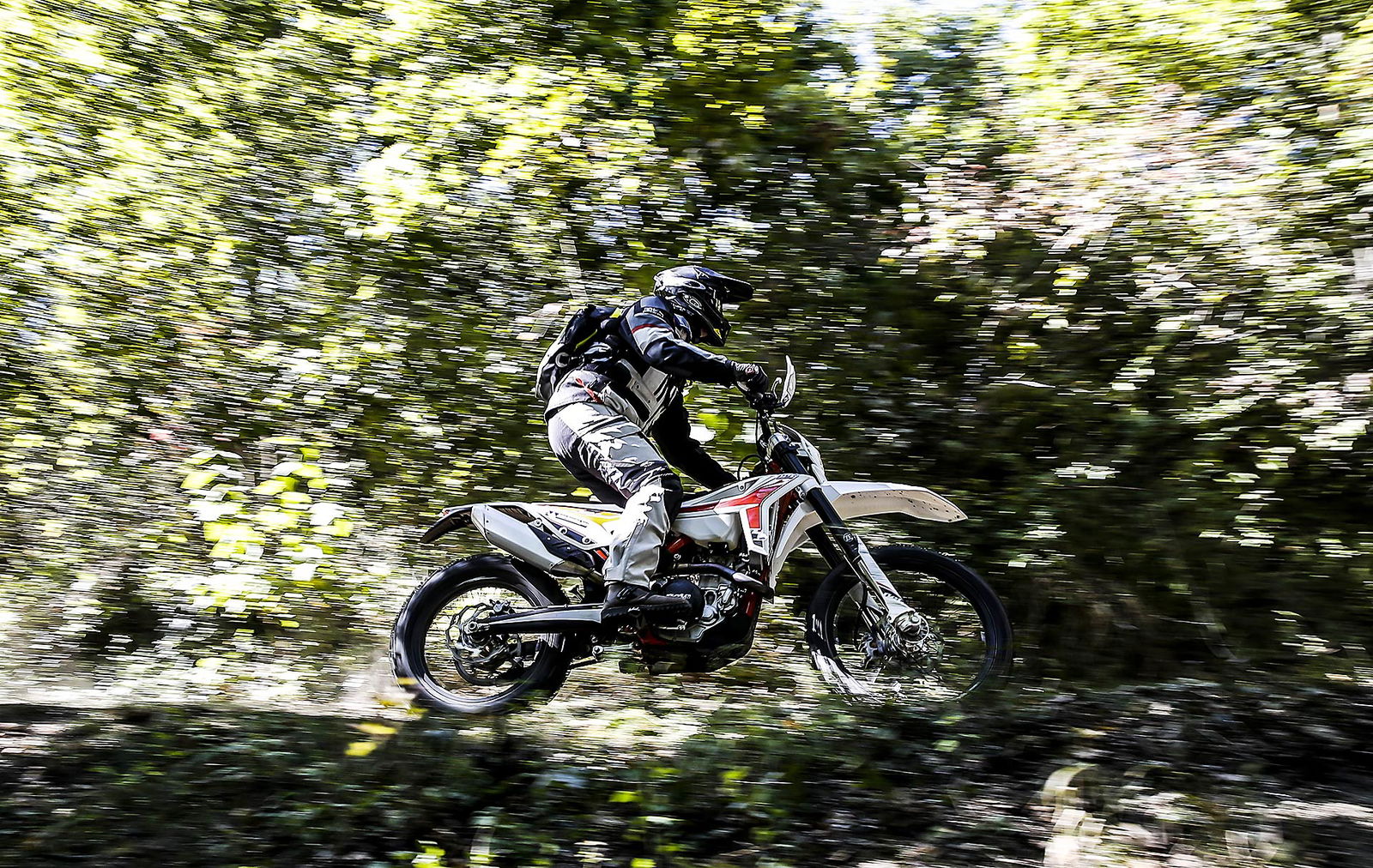 La Beta RR 350 è l’unica del nostro confronto con questa cilindrata: 350 centimetri cubi perché la casa toscana parte da questa cubatura che però sia ben chiaro sta di diritto nella categoria perché riconosciuta anche nel campionato mondiale enduro: le 250 quattro tempi e le 350 corrono insieme.Telaio in acciaio al cromo-molibdeno, sospensioni completamente regolabili della ZF con forcella da 48 mm di diametro e mono ammortizzatore con leveraggio progressivo. Interasse da 1.490 mm escursione della ruota anteriore di 295 mm e posteriore di 290; disco da 260 mm con pinza flottante e dietro da 240 mm. Il motore a iniezione elettronica a quattro valvole in titanio, il serbatoio da 9 litri e il peso dichiarato è di 107,5 kg a secco con la sella alta 940 mm.