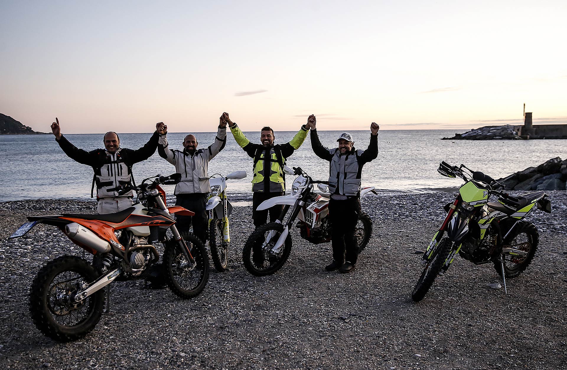 Alla fine ce l’abbiamo fatta. Dalla città al mare in sella a moto che per natura non amano viaggiare salvo percorrere antiche vie e mulattiere dismesse. Un viaggio così merita tempo e pazienza, bisogna mettere in conto qualche chilometro di raccordo da percorrere sull’asfalto e considerare che alcuni sentieri non sono più agibili e i letti di alcuni fiumi in secca sono estremamente faticosi da attraversare. In questo tutte le quattro protagoniste ci hanno aiutato e si sono comportate bene: chi meglio nel fuoristrada, chi invece faticando un poco di più. Santo l’avviamento elettrico che le ha fatte partire e ripartire anche dopo una caduta sempre al primo colpo. Infine la voce consumi una vera sorpresa dopo aver percorso quasi 500 km in due giorni. Stupiscono di più i 29,3 km/litro di Fantic o i 23,7 di Beta? Nel mezzo KTM a 26,4 km/litro e Husqvarna a 25.