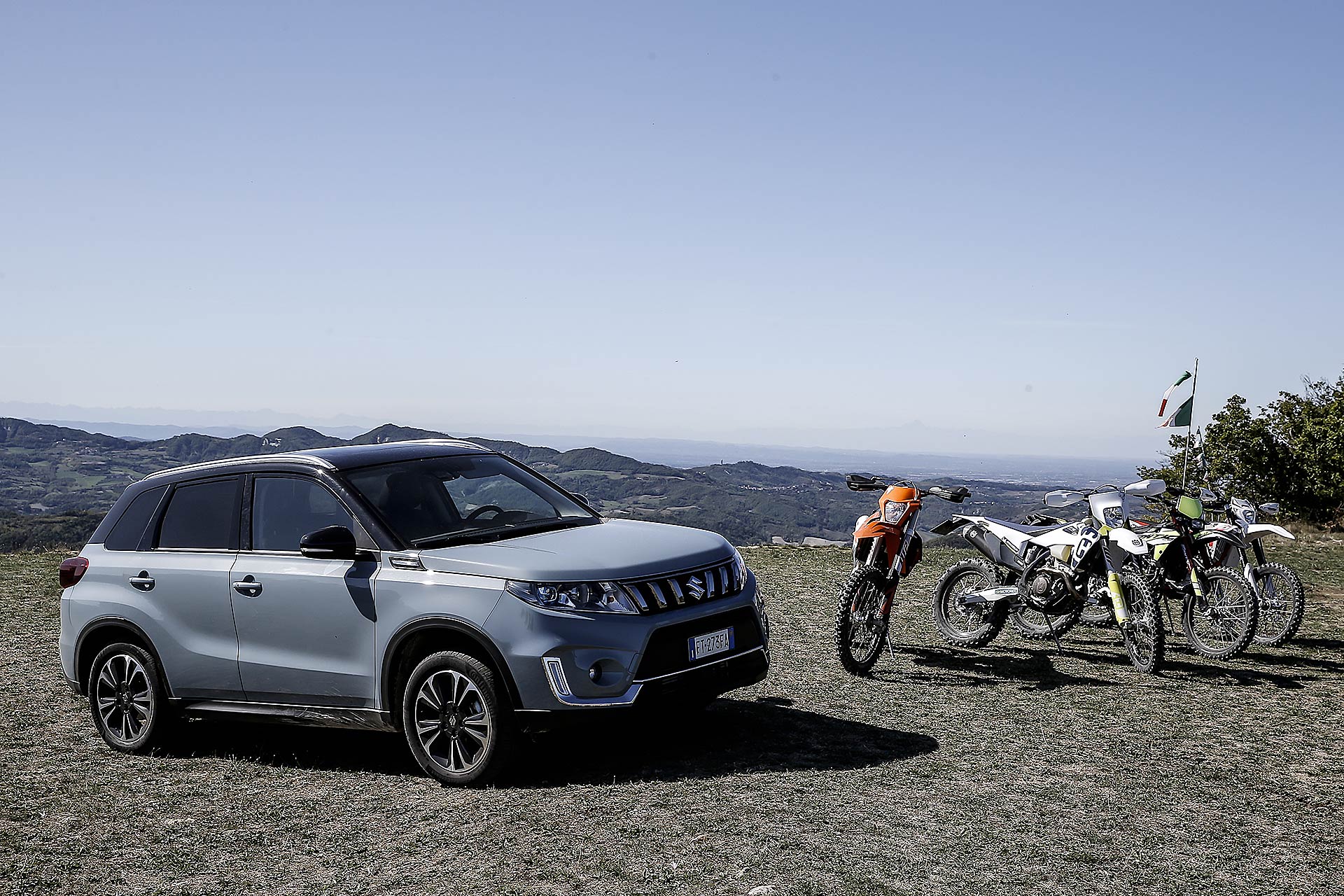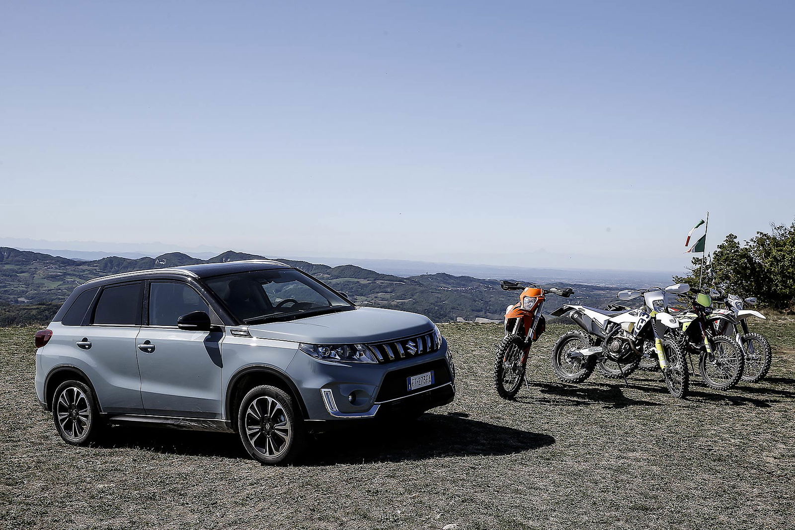 Bello il giro in moto, ma se non c’è chi ti riprende/fotografa, come lo racconti? La nostra troupe ci ha seguito alla guida di Suzuki Vitara equipaggiata di motore benzina 3 cilindri da 998 centimetri cubi e 111 cavalli. Le prestazioni non soffrono il confronto con la massa del SUV giapponese, le quattro ruote motrici. La sua capacità di carico è stata fondamentale per il nostro viaggio vista il volume del bagagliaio che da 375 passa fino a 1120 litri con sedili abbattuti, tanto spazio per l’attrezzatura tecnica e le nostre borse. Il motore sovralimentato ha spinto con decisione nelle salite degli Appennini liguri e anche sui terreni a bassa aderenza aiutato dalla trazione integrale. Consumo rilevato 6,4 litri per 100 km ma siamo andati di piede pesante guidando con marce corte!