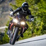 Dischi freno da 330 millimetri, pinze radiali Brembo M50. Non guardate le foto e penserete che stiamo parlando della RSV4 1100 Factory. In effetti, c’è molto della sorella sportiva “sotto” la Tuono che però ha misure completamente differenti, perché il manubrio alto va aiutato con una ciclistica più “lunga”, più stabile. I numeri parlano di 1.450 mm di interasse, 99,7 mm di avancorsa e 24,7 gradi di inclinazione cannotto. La sella è a 825 mm, il peso in ordine di marcia 209 kg, il serbatoio contiene 18,5 litri di benzina da bruciare velocemente divorando una curva via l’altra. Particolarità? È l’unica tra le moto della comparativa a montare un pneumatico posteriore da 200/55.