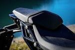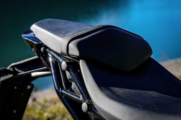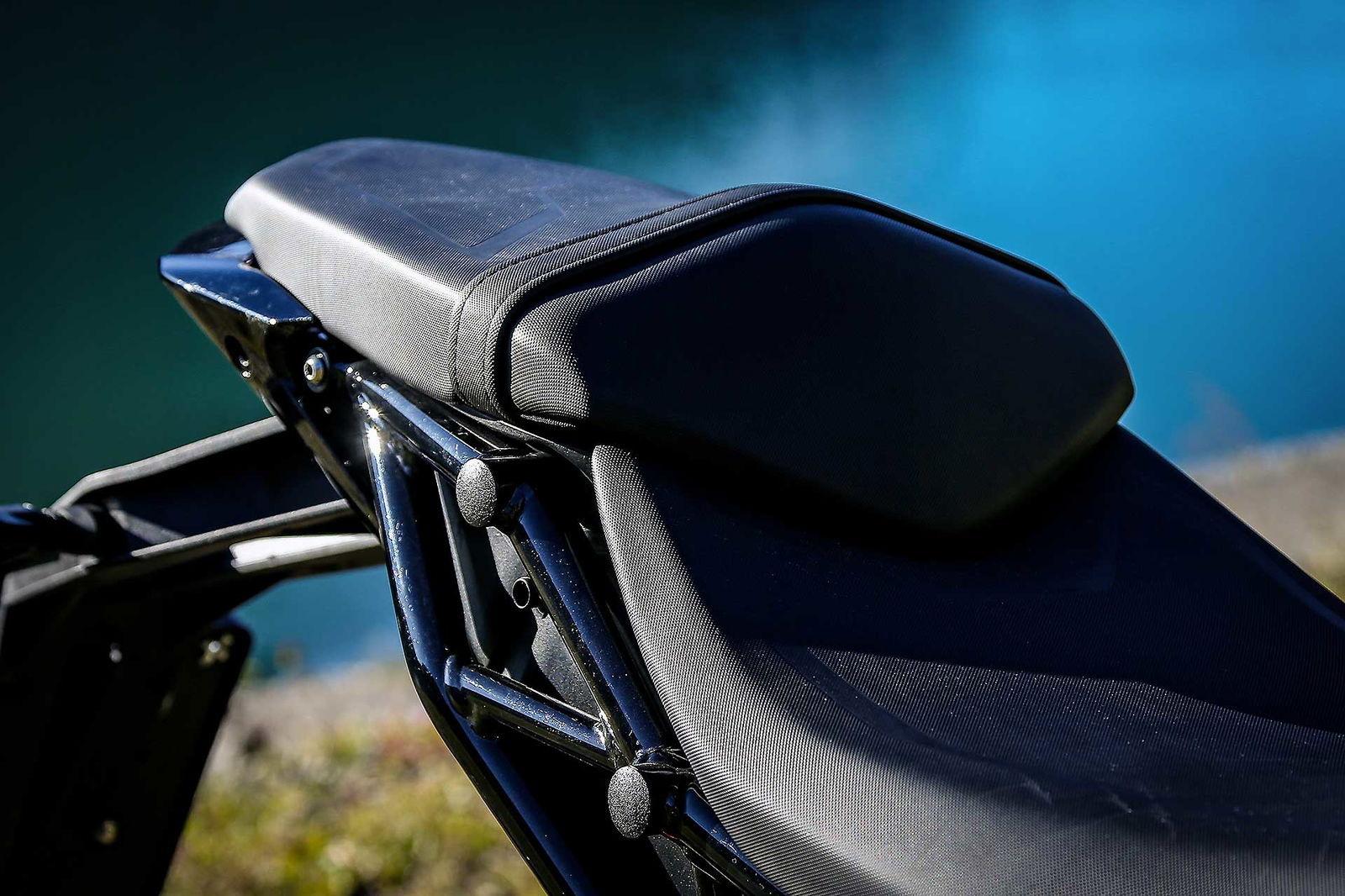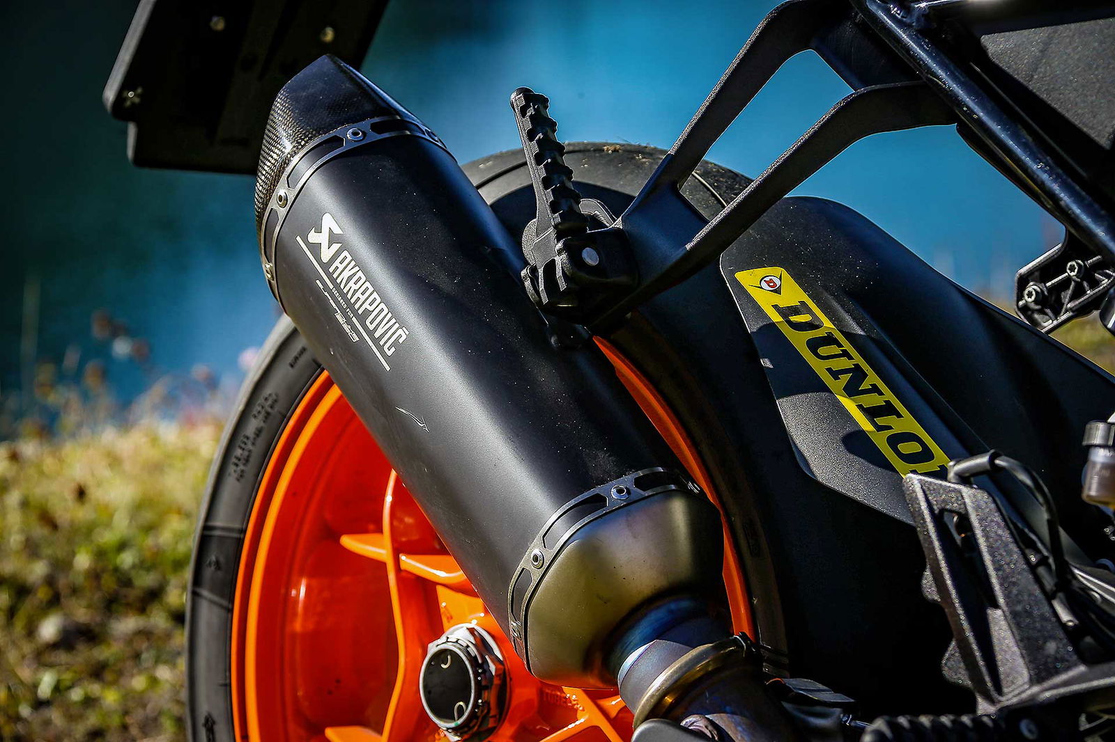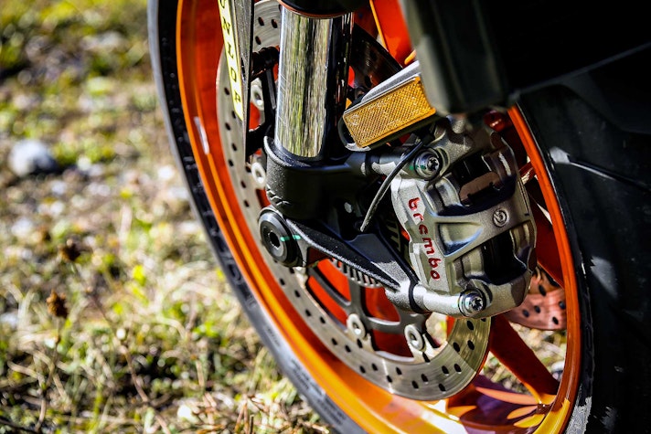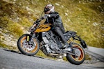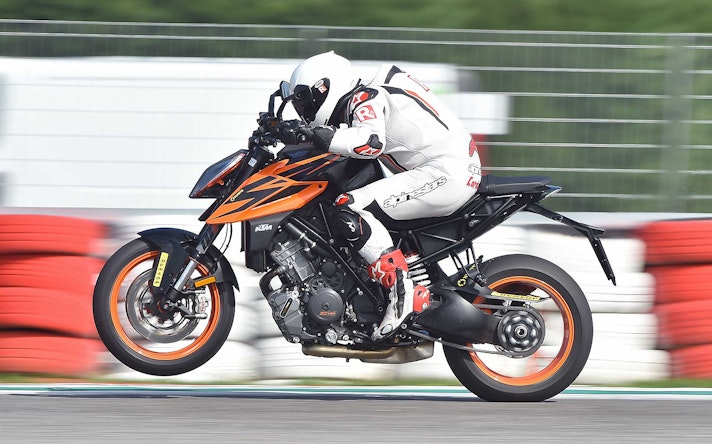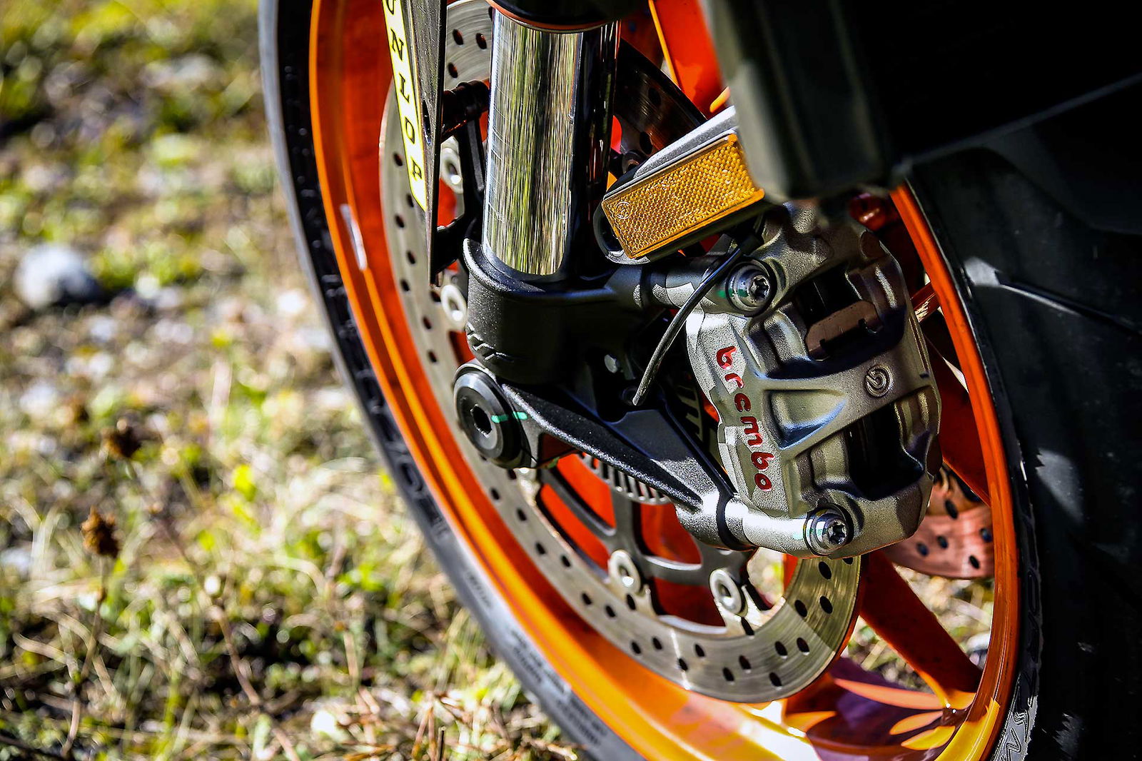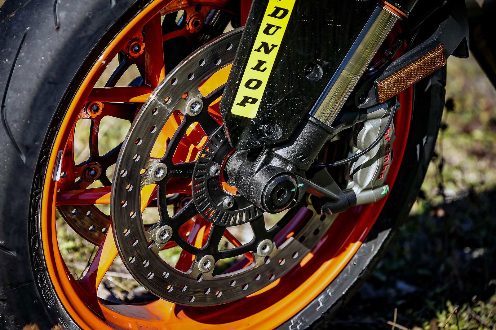 Ride by wire multimappa, piattaforma inerziale, frizione antisaltellamento, gestione freno motore, traction control ABS cornering. Il pacchetto Track con la mappatura aggiuntiva, il quickshifter e l’MSR Motor Slip Regulation, che consente di gestire il freno motore si pagano a parte, rispettivamente 399, 349 e 145 euro. Avrete capito che, sospensioni semiattive a parte, quanto a dotazione la super naked di Mattighofen è veramente al top. La frizione è idraulica, i freni sono griffati Brembo, le pinze monoblocco M50 come quelle di Monster e Tuono. Insomma, c’è tutto quello che serve per essere una vera superbike con il manubrio alto. Una Superbike che ha quote che vanno in cerca della stabilità: 1.482 mm di interasse, 102 di avancorsa e 24,9 gradi di inclinazione cannotto. La distingue dalle altre la filosofia delle sospensioni: KTM è l’unica a usare WP, la forcella ha steli da ben 48 mm di diametro, e la particolarità la troviamo nell’escursione molto ampia della ruota posteriore ben 156 mm, quasi da motard. Non è un caso quindi che la sella della SuperDuke sia quella piazzata più in alto di tutte: 835 mm.
