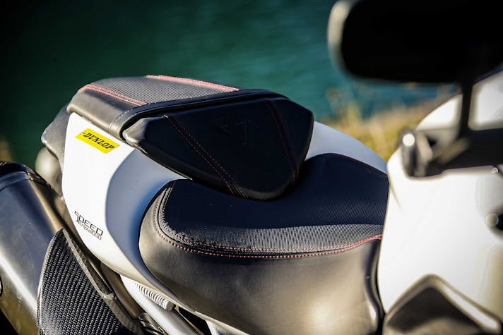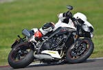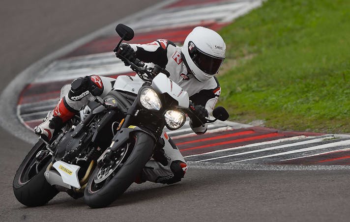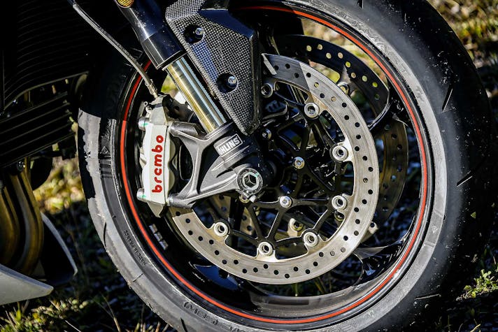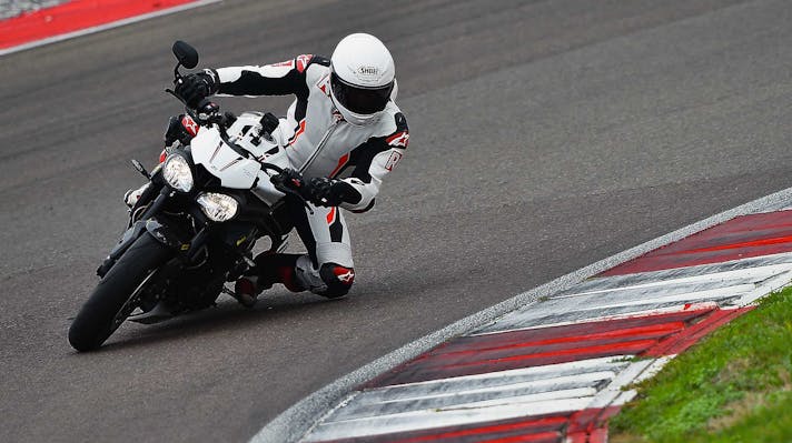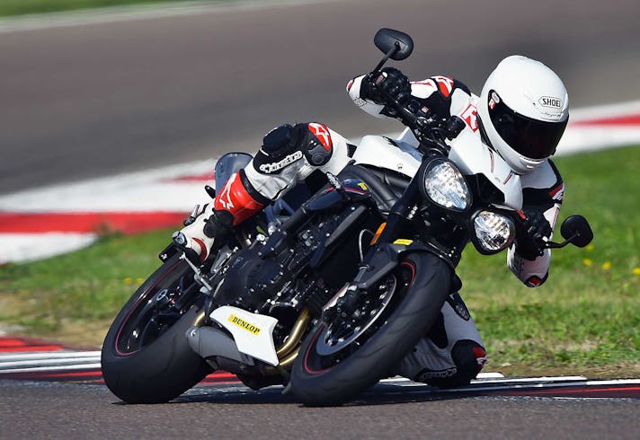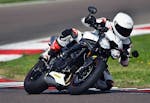 Così se escludiamo le pinze M50 e le sospensioni semiattive, sulla Speed c’è tutto quanto di meglio si possa desiderare. Una moto che, un po’ come accade per la KTM, fa esattamente tutto quello che le chiedi. La senti in mano, non è mai sopra le righe. Le sospensioni, in particolare, sono pregiatissime: meccaniche vero, ma la Öhlins NIX 30 regge quasi il passo delle semiattive per come scorre, copiando ogni minima asperità e per come sostiene nella guida d’attacco. Davvero eccellente, così come eccellente è il monoammortizzatore, che con pochi click è passato dalla strada alla pista offrendo ancora un range di erogazione incredibilmente ampio, sia verso il rigido sia verso il morbido. Segno di una taratura di base perfettamente azzeccata.Unica con la pompa radiale a interasse variabile, la Speed ha tuttavia una piccola imprecisione nella frenata con una corsa della leva non sempre costante, cosa che abbiamo migliorato dopo uno spurgo in pista. In particolare sull’esemplare che avevamo in prova la prima pompata aveva sempre la corsa leggermente più lunga. Quanto a posizione di guida la Triumph si è issata in cima alle preferenze dei tester: corta, compatta, con manubrio e pedane al posto giusto. Solo qualcuno si è lamentato di una imbottitura della sella un po’ dura.