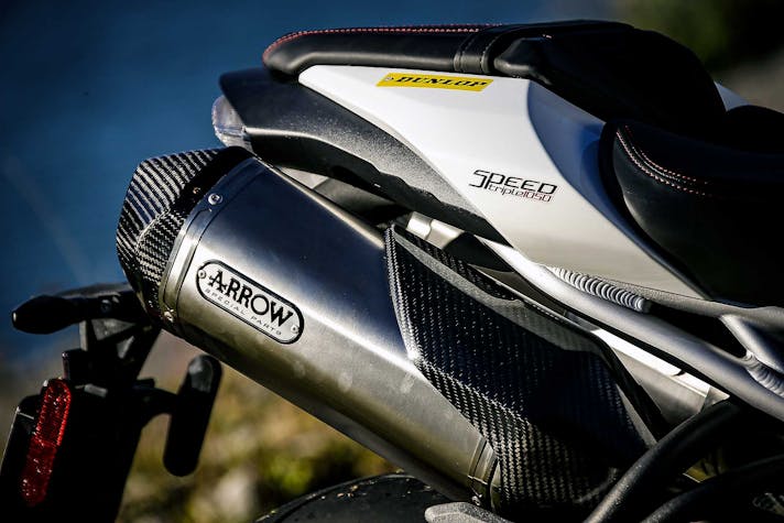 In pista emerge invece qualche limite che posiziona la Speed nel segmento delle moto per divertirsi ma non per cercare il time attack. Freno motore un po’ troppo presente, un po’ di on-off (usando mappatura Track), poca scorrevolezza e una certa inerzia nei cambi di direzione (lo scarico alto fa il suo in questo) la rendono meno incisiva quando vuoi spingere per cercare il tempo. Tra i cordoli emerge invece ancora la grande qualità delle sospensioni e anche l’ottimo livello dei controlli elettronici, inoltre il motore non si tira indietro quando si tratta di allungare, anche se in pista la cambiata ideale arriva circa 1.000 giri prima della zona rossa. Probabilmente la rapportatura di serie mal si sposava con il layout del circuito di Cremona: un po’ troppo corta la seconda, un po’ “sgonfia” la terza, il che non ha aiutato. Giocando con i rapporti la Speed avrebbe fatto sicuramente meglio. Ma noi stiamo provando una moto di serie.
