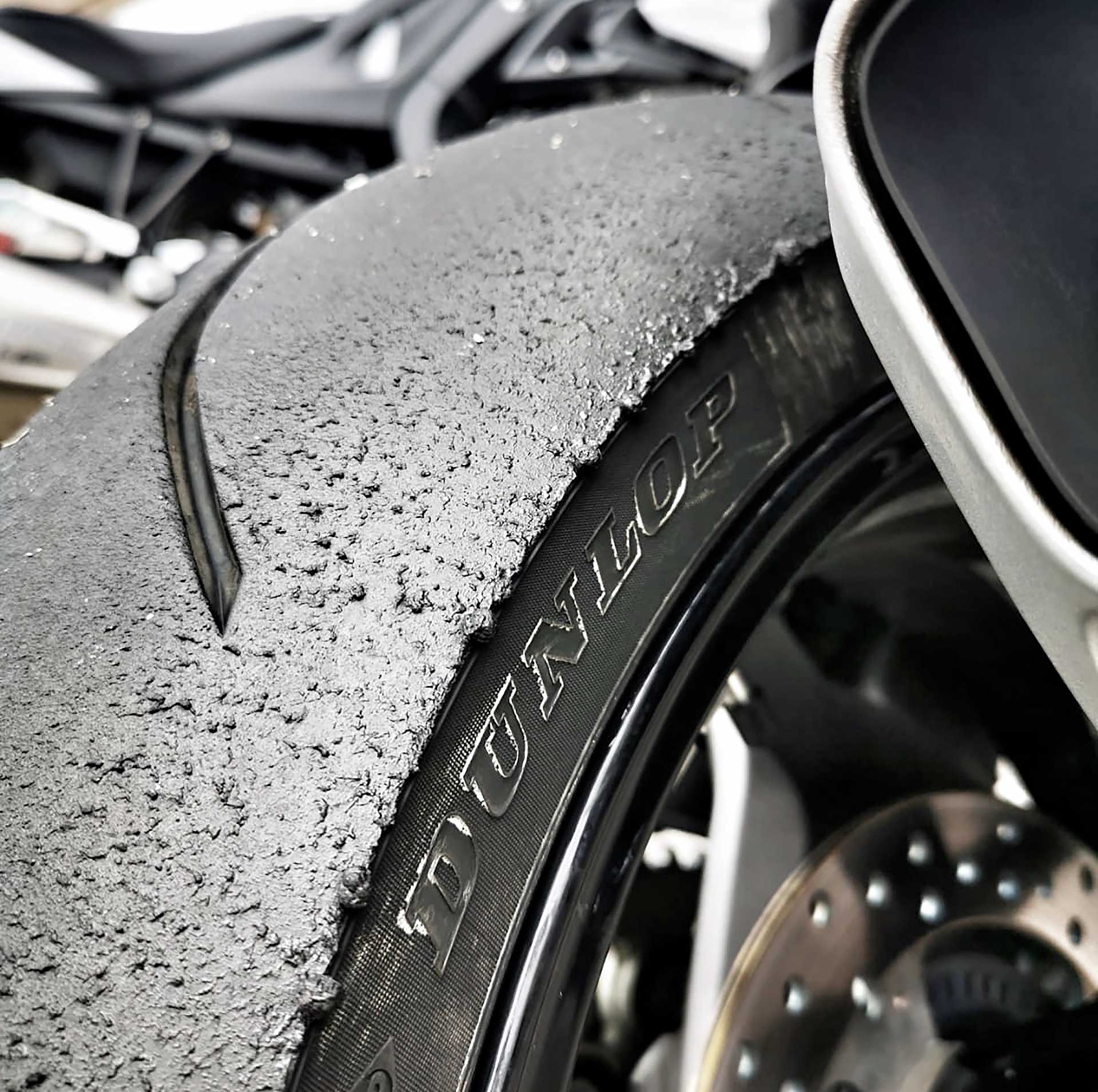 Ma, utilizzando molto la moto su strada proprio vuole anche un comportamento sul bagnato che sia molto più che semplicemente “accettabile”. Pressioni? Su strada Dunlop raccomanda rigorosamente pressioni indicate dal libretto del costruttore.In pista le Dunlop invece consentono di “giocare” molto, parliamo di un range piuttosto ampio visto che partendo dalle pressioni stradali possiamo arrivare a 1.7 bar al posteriore. Attenzione, però, fatelo solo con le Dunlop, le altre pressioni così basse non le reggono. Per la sessione di pista al Cremona Circuit abbiamo deciso di utilizzare una pressione di 1.8 al posteriore e 2.1 all’anteriore, perché queste moto hanno veramente tanta coppia e “spingono” molto sulle gomme. Meglio non esagerare, quindi. Alla fine dopo oltre 1000 km tra strada e pista, la situazione è quella che vedete nella foto… direi niente, niente male.