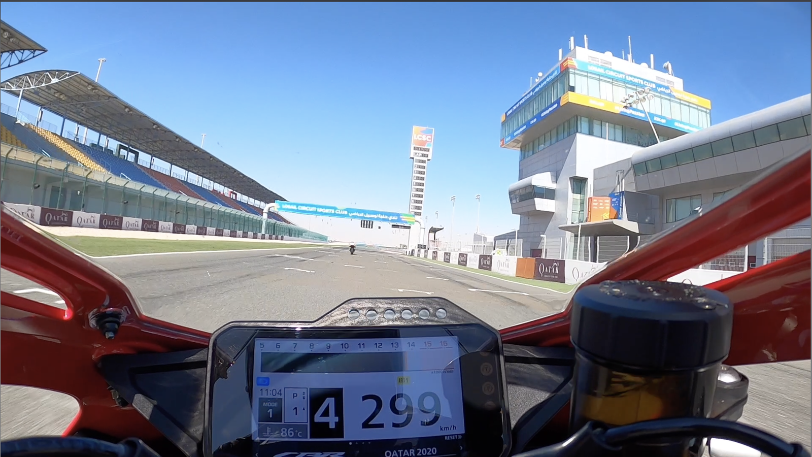 Il quattro cilindri urla, spinge forte davvero. I 301,2 km/h rilevati dal mio acquisitore GPS in quinta marcia non sono km/h “finti”, è roba che scotta e fa capire il potenziale di questo motore, che se ha un punto debole è nell’erogazione ai bassi, frustrata da una rapportatura finale esageratamente lunga. Così Losail diventa una pista da seconda marcia, il tornantino si fa in prima, marcia che in staccata si innesta senza problemi (guardate il video on board) quando il tachimetro segna ancora i 144 km/h… Cambio peraltro perfetto, una schioppettata, sia in salita sia in discesa: anche in questo caso Honda ha fatto un lavoro eccellente.