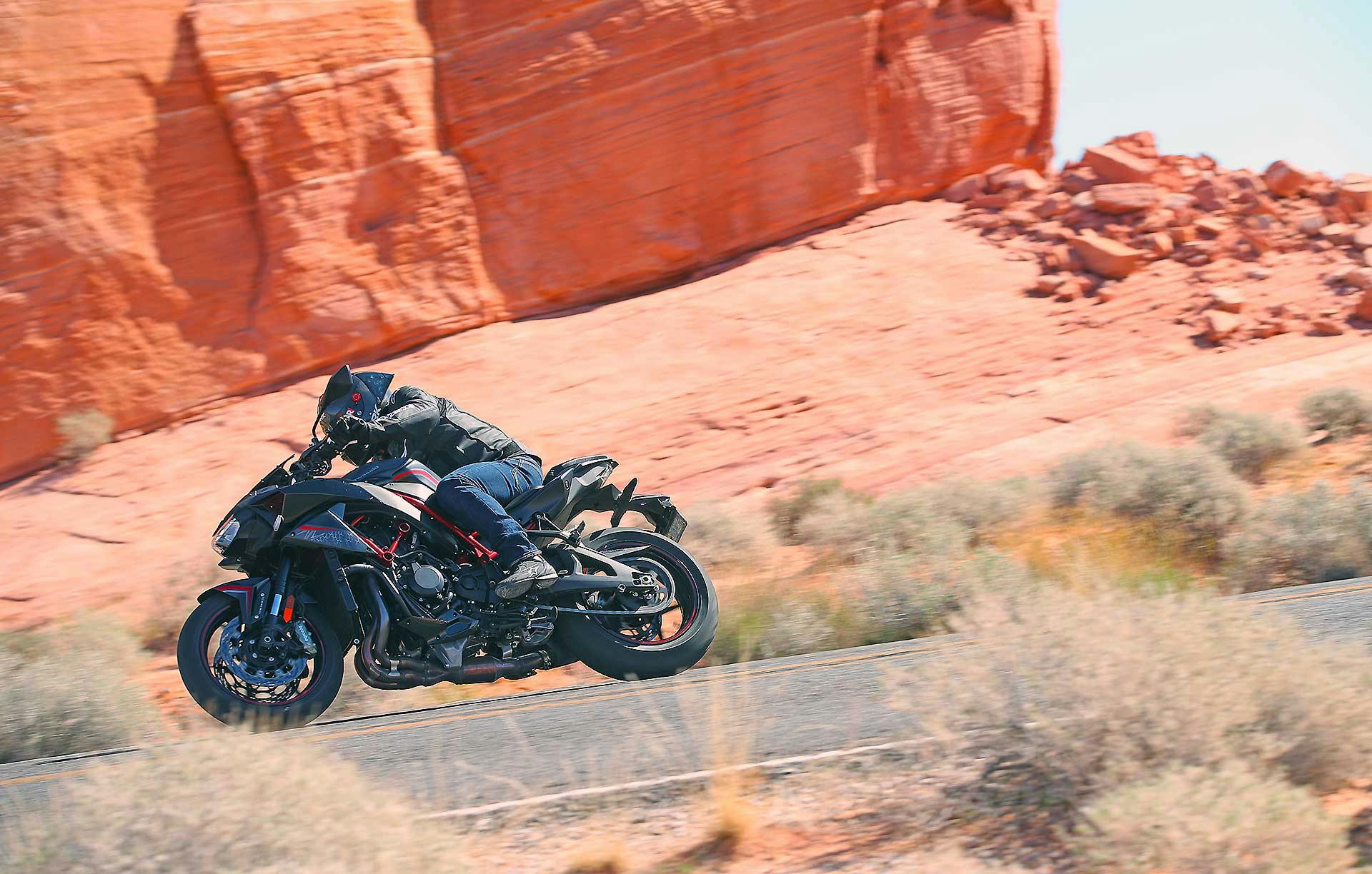 Avrete capito insomma che la Kawasaki non ama essere violentata, ma piuttosto va assecondata con una guida fluida, lei in questo caso vi ripaga rivelandosi una splendida naked stradale con un gran bell’avantreno e una ciclistica che resta sempre molto stabile e mai nervosa, certificata da un avantreno piantato a terra. Che sicuramente non è così svelto nel traffico o sullo stretto ma molto gratificante sul misto veloce (o velocissimo). Molto bene il controllo del gas e le mappature e i controlli pur non super raffinati (ad esempio non è possibile regolare separatamente anti wheelie e traction control) funzionano bene.