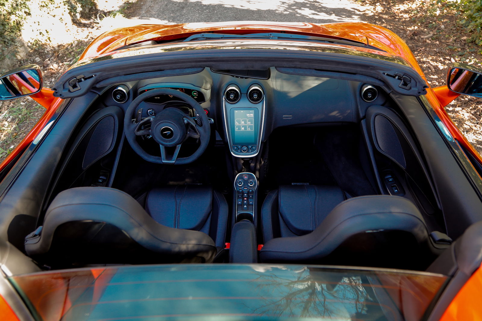 Mi perdonino i fan di Greta Thunberg, i vegani e gli ecologisti più integralisti, ma quest’auto, anche se inquina quasi come una portaerei, è uno dei motivi per cui faccio questo lavoro. Perché McLaren è l’essenza stessa della supercar, fin dai tempi della iconica F1, progettata da un certo Gordon Murray. E se è vero che la 570S è comunque l’entry level della gamma spider, le soluzioni tecniche adottate sono da iper-uranio delle supercar. Il telaio è monoscocca in fibra di carbonio e contribuisce a limare il peso fino a 1.498 kg in ordine di marcia. Di questi, solo 46 sono da imputare al meccanismo del tetto apribile, che sparisce dietro la testa in soli 15 secondi e fino a 40 km/h.