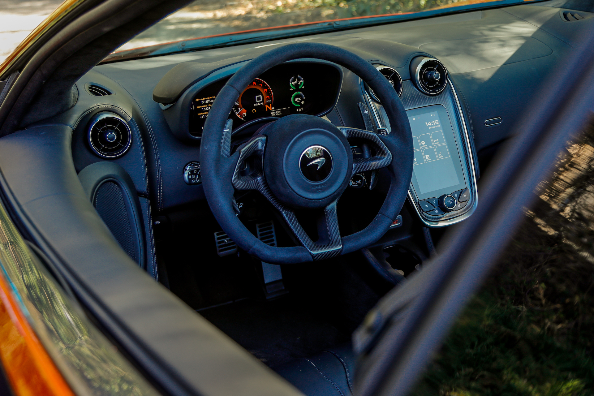Ma il fatto che sia una supercar non significa che la 570S renda le cose (troppo) difficili nella vita quotidiana. L’unica eccezione riguarda l’ingresso – pardon, la discesa – in abitacolo: nonostante l’apertura delle porte verso l’alto, ci vuole un fisico piuttosto agile per accomodarsi. Una volta seduti, però, lo sforzo viene ampiamente ripagato con un abitacolo costruito su misura del pilota. Il sedile offre il sostegno ideale e tutto è orientato alla massima prestazione, con il minimo sforzo. Tre sono i mood della 570S Spider: Normal, Sport e Track. Se la prima modalità è talmente bonaria che sarebbe perfetta anche per vostra zia, con le altre due si comincia a fare sul serio.