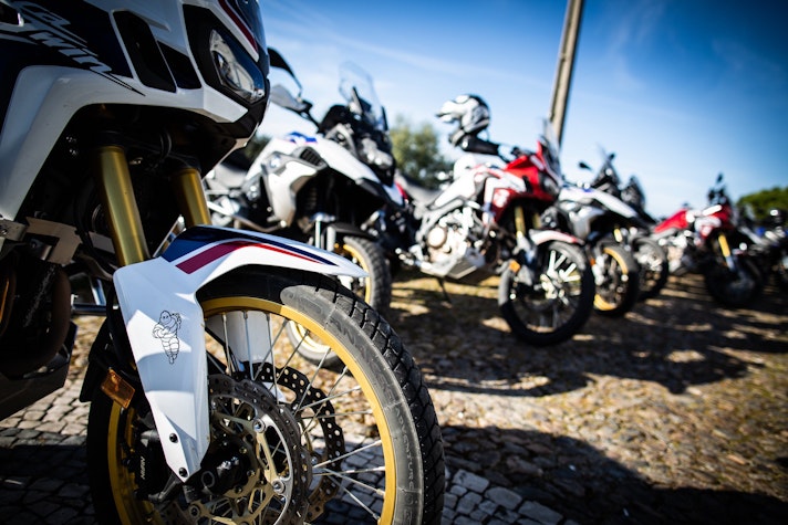 Giusto un veloce “recap”, quindi: le Michelin Anakee Adventure hanno un disegno del battistrada particolarmente ricco di intagli, per offrire il giusto grip quando l’asfalto sparisce e, allo stesso tempo, evacuare più facilmente l’acqua. Omologate M+S, hanno nuove mescole che usano più Silice, per aumentare grip e resistenza all’usura (tecnologia 2CT davanti e 2CT+ dietro). Primo equipaggiamento di mezzi quali BMW R 1250 GS e Moto Guzzi V85 TT, hanno prezzi generalmente compresi fra i 250 e i 300 euro al treno. Ma adesso – dopo la tabella con le misure – è giunto il momento di mettere alla prova le Anakee Adventure su un percorso appositamente studiato in Portogallo, tra Lisbona ed Evora.