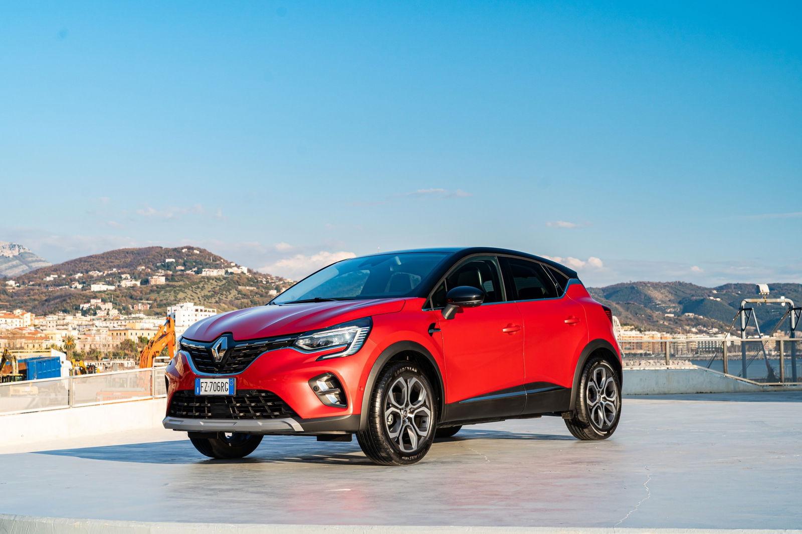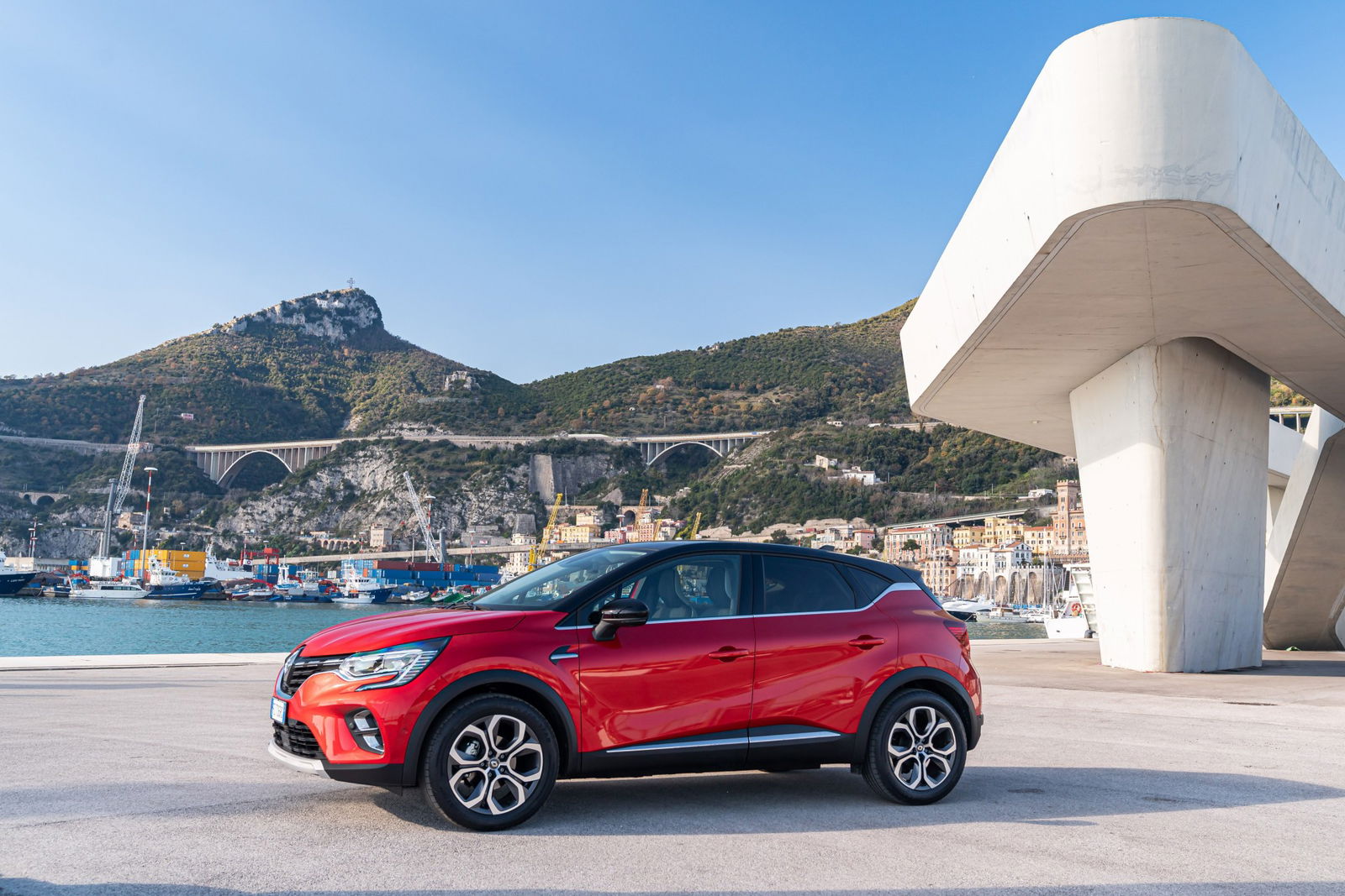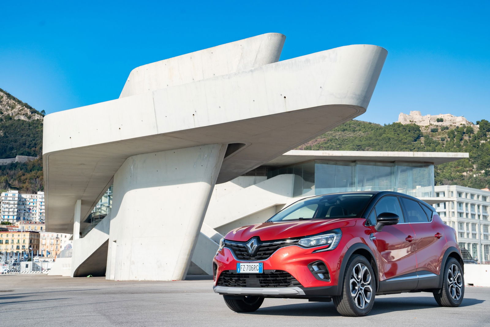 Gli ultimi chilometri fino a Salerno sono tutti con il sole in fronte. Ci godiamo l’ultimo tratto di Costiera al piccolo trotto, immaginando che incubo possa essere percorrerla nei mesi più “caldi” dell’anno. All’ingresso della città deviamo verso il porto, dove campeggia il terminal marittimo disegnato da Zaha Hadid. Un intreccio di curve capace di dare leggerezza a elementi di cemento sospesi che pesano tonnellate. L’architetto irachena è stata una dei maestri del Decostruttivismo (partendo da un disegno con strutture, geometrie e canoni estetici tradizionali lo si spoglia, lasciando volumi plastici e forme pure e disarticolate, destrutturando linee dritte e piegandole senza apparente necessità) e il suo edificio è il perfetto sfondo per fotografare le linee della nuova Captur.