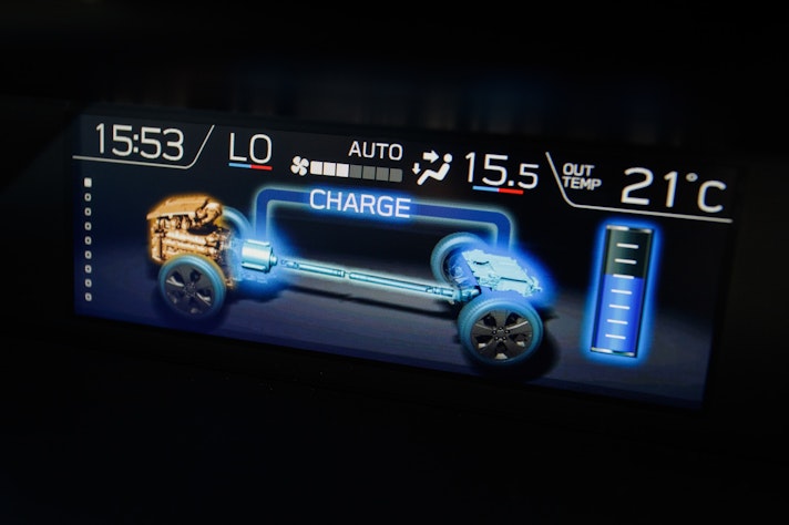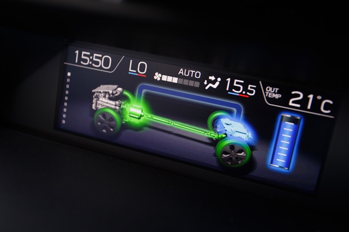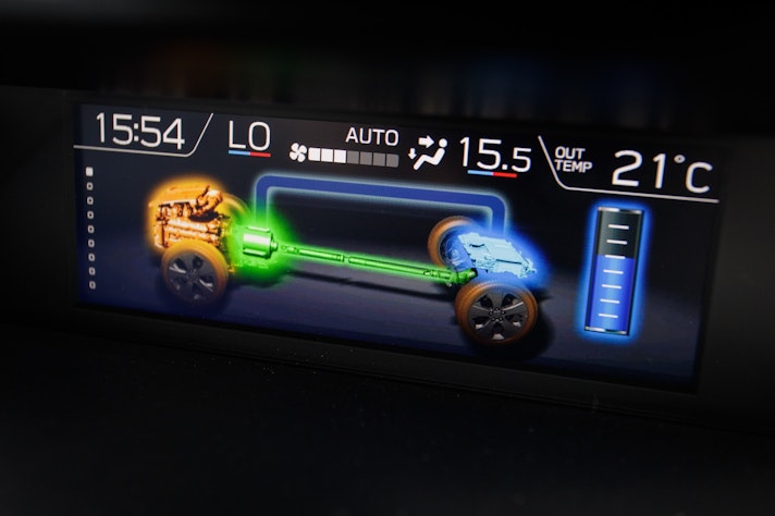 Tornando alle batterie, sono agli ioni di litio, si ricaricano durante i rallentamenti oppure sono ricaricate dal motore termico quando le condizioni sono più favorevoli. Gli ingegneri le hanno piazzate sotto del bagagliaio, senza limitare la sua capacità di carico, che è di ben 509 litri. L’intero pacco pesa appena 25 chili e si inserisce perfettamente nella nuova piattaforma SGP Subaru Global Platform. Rigido e leggero al tempo stesso, il pianale garantisce anche una migliore abitabilità, ma questo ve lo racconto meglio nella prossima pagina, mettendomi al volante per prova su strada.