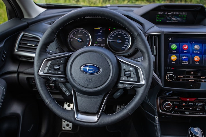Salire a bordo della Subaru Forester e-Boxer è molto agevole. Le porte hanno un ampio angolo di apertura e le sedute sono alla giusta altezza, perfettamente a portata di natica. Rispetto al passato l’abitacolo appare più spazioso, sia in larghezza che in lunghezza. In questo senso chi ci guadagna di più sono i passeggeri posteriori, che hanno 33 mm in più per le ginocchia e ora hanno anche bocchette dell’aria tutte loro. Il posto di guida è impeccabile e le ampie regolazioni del sedile e del volante permettono a tutti di trovare la posizione preferita. La plancia appaga sia la vista sia il tatto. A voler trovare il proverbiale pelo nell’uovo, si può giusto criticare la grande quantità di pulsanti sul cruscotto e sul volante, che non sempre si azionano in modo intuitivo.