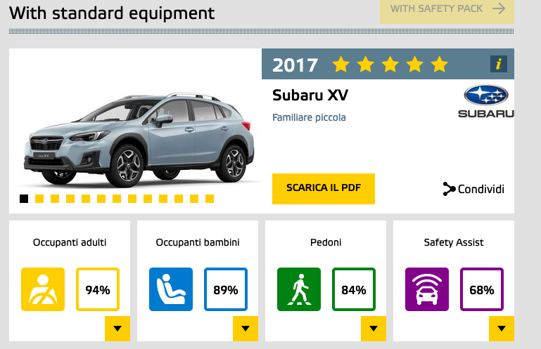 Nei crash test EuroNCAP, la XV si è meritata le 5 stelle. Il massimo dei voti, frutto sì dell’alto livello di protezione offerto in caso di impatto, ma anche di tutti i sistemi atti a prevenirli, gli incidenti. La telecamera stereoscopica denominata Eyesight, di serie, permette infatti il funzionamento di vari dispositivi, tra cui la frenata automatica di emergenza, l’avviso di superamento involontario della corsia e il cruise control adattivo.