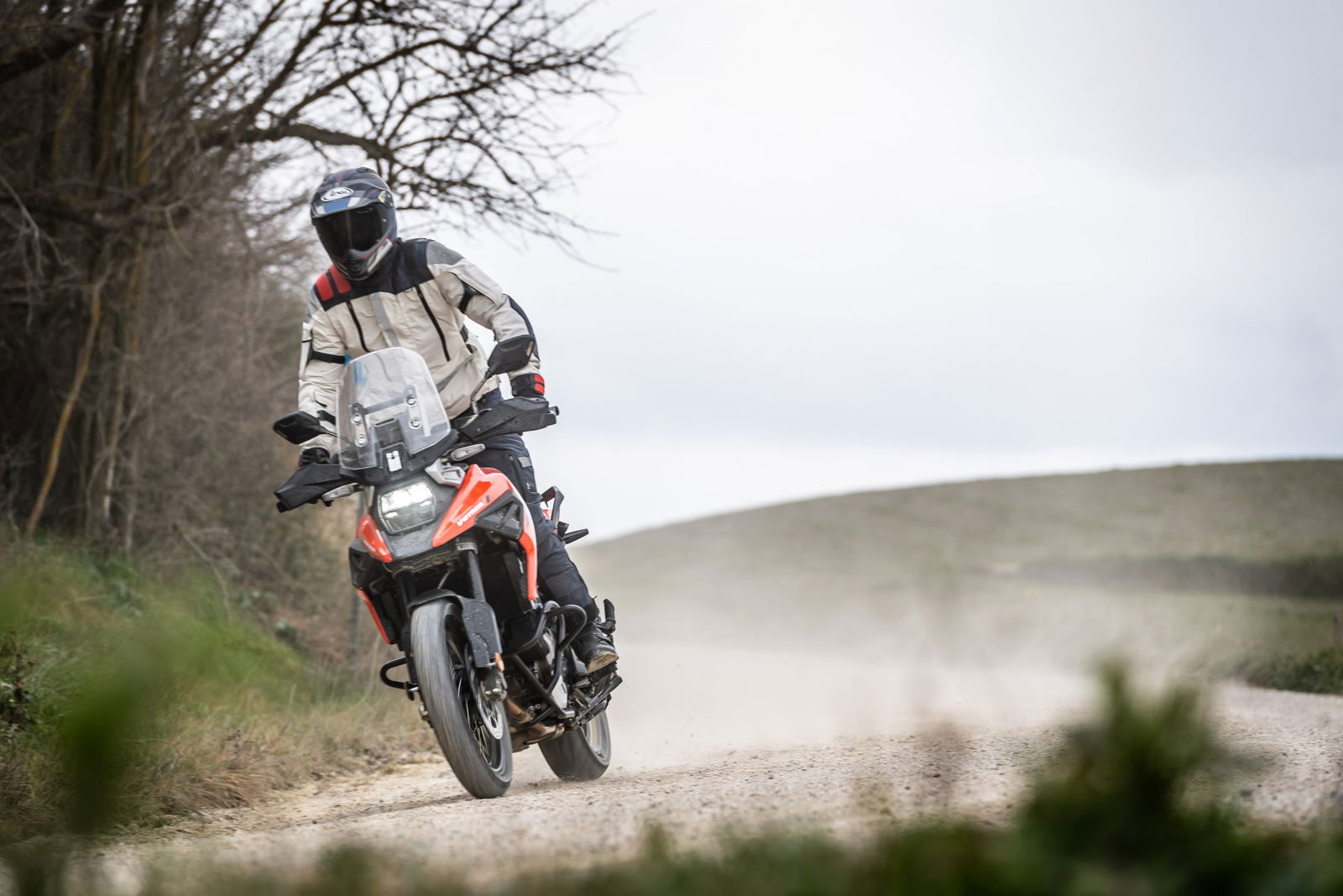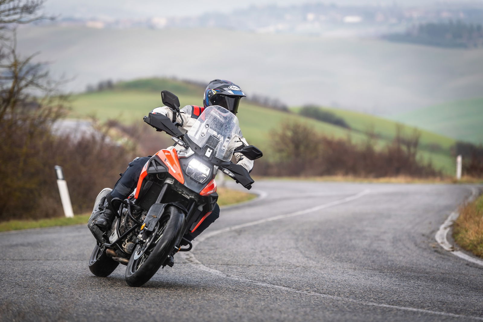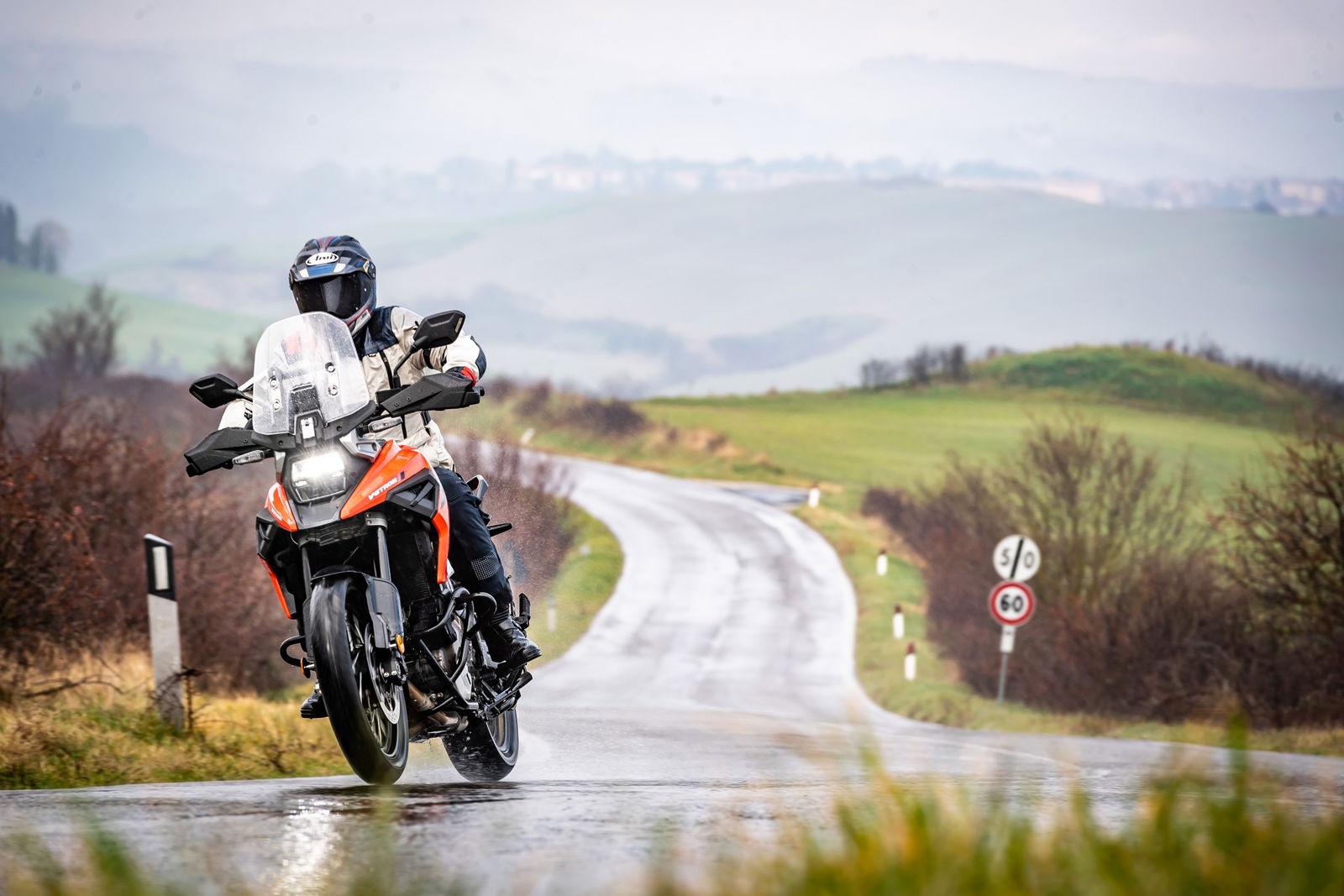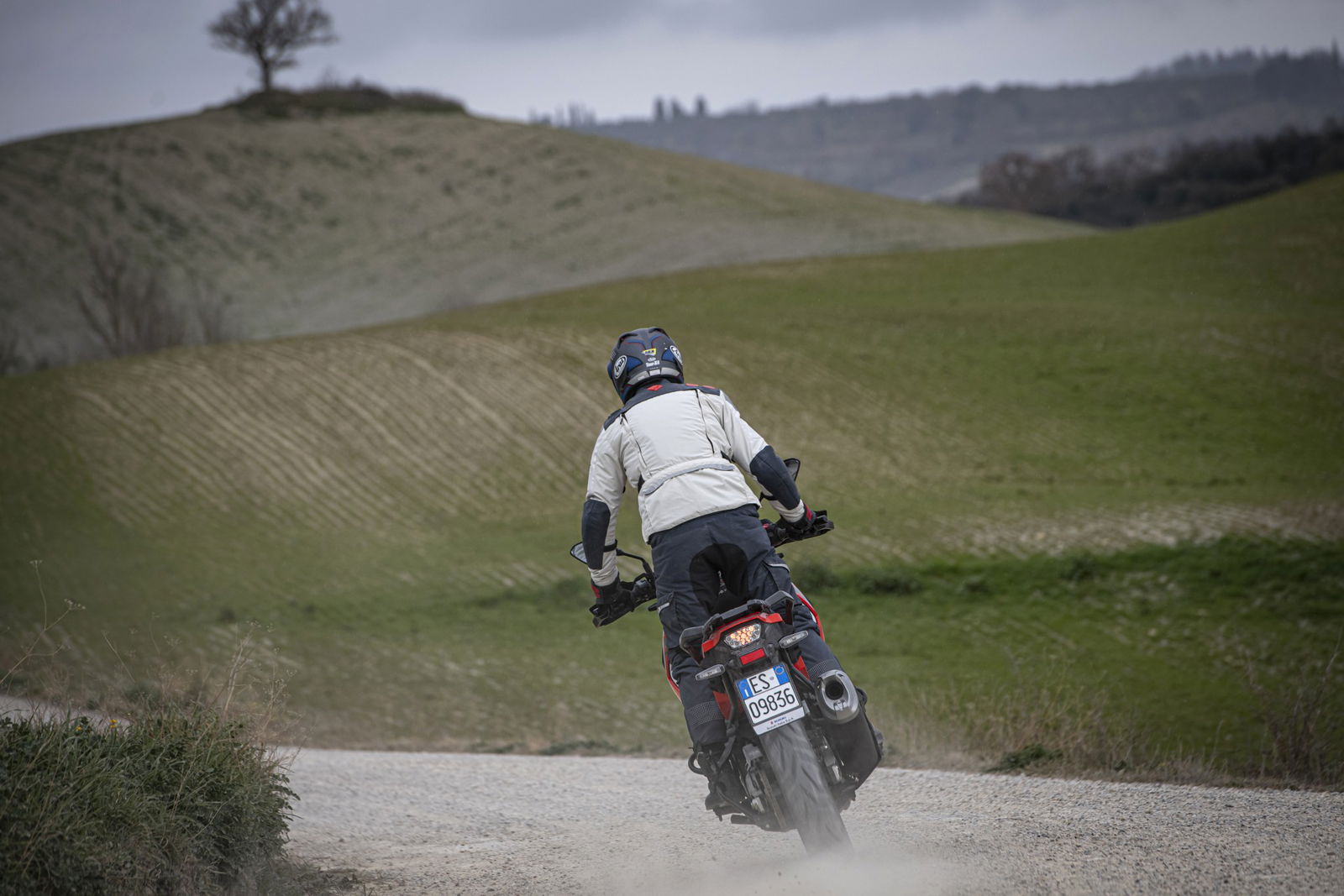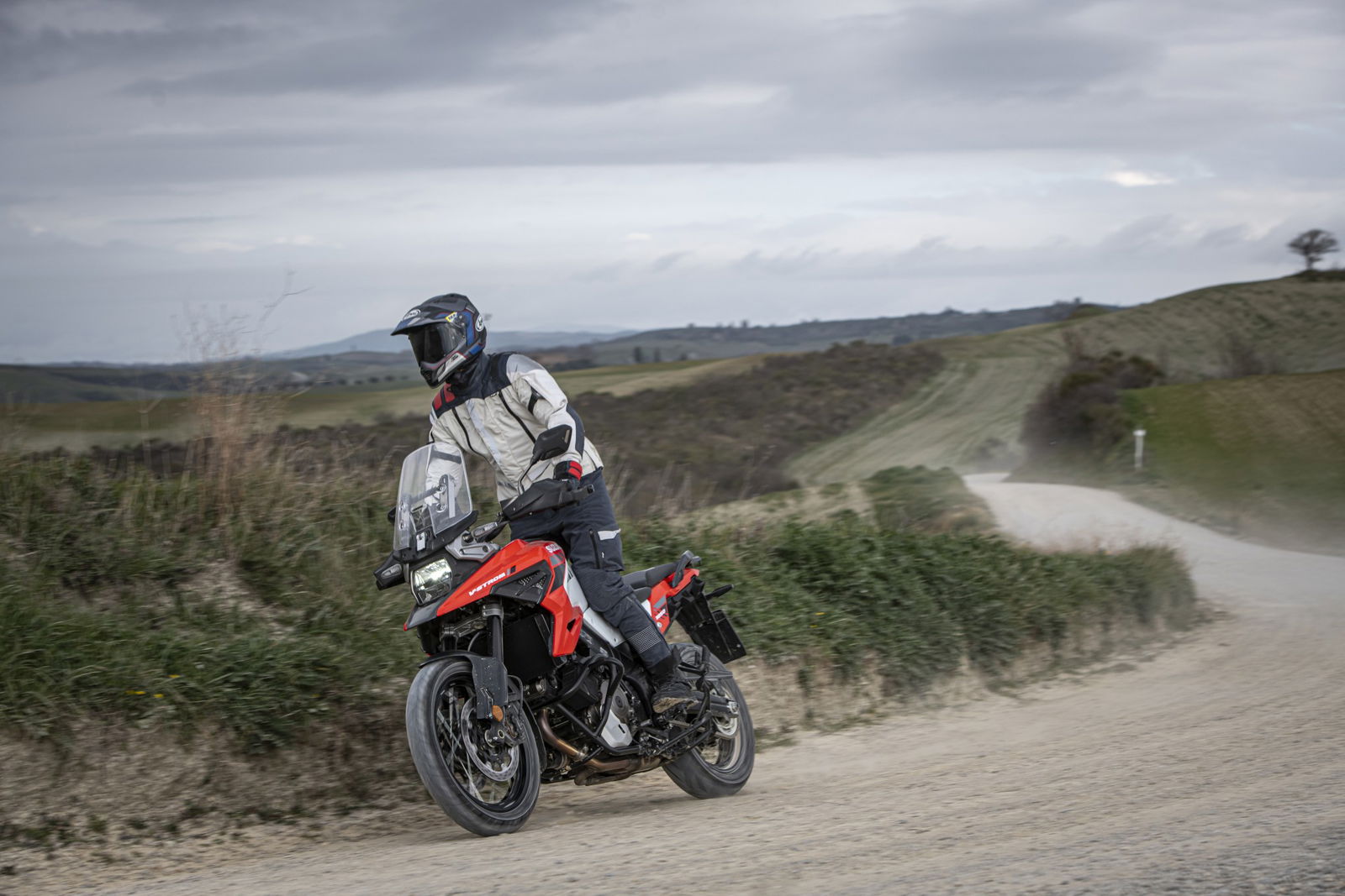 In Suzuki, come ho già detto, la chiamino Sport Enduro Tourer, ma la nuova V-Strom 1050XT è orientata principalmente alla guida su strada. In primo luogo per le sue caratteristiche dinamiche, quindi per la posizione di guida. Nonostante i fianchi stretti che permettono di stringerla bene fra le ginocchia, l’efficace rivestimento antiscivolo della sella e le pedane con gommini staccabili, il manubrio si trova infatti un po’ troppo in basso, quando ci si alza sulle pedane. Inoltre, le Bridgestone Battlax Adventure A41 di primo equipaggiamento sono gomme prettamente stradali. Non fraintendete, per esplorare gli sterrati delle colline senesi e qualsiasi altra strada bianca, i problemi sono zero, se però si vogliono affrontare terreni più impegnativi, su questi due aspetti si deve intervenire (peraltro in modo semplice e poco oneroso).